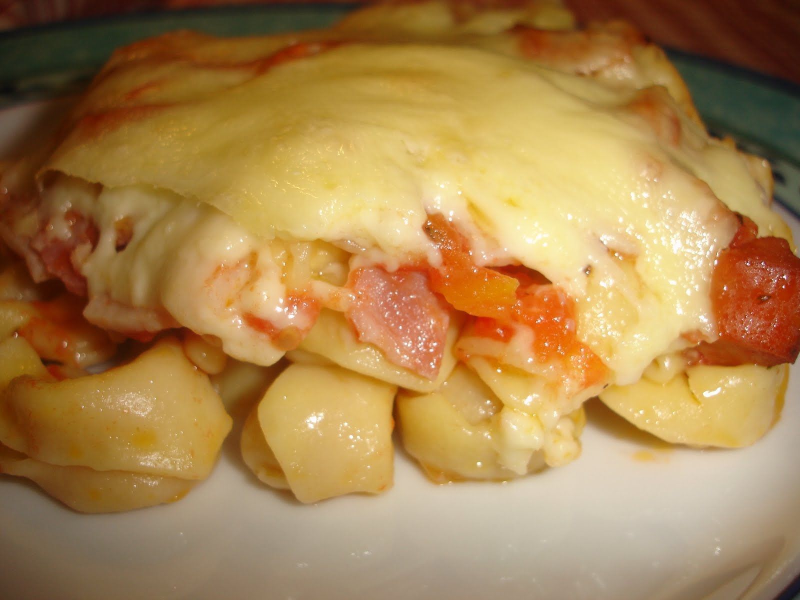 Υλικά (για 6 μεγάλες μερίδες) 2 πακέτα τορτελίνια 4 λουκάνικα Φρανκφούρτης 5 φέτες καπνιστή γαλοπούλα 10 φέτες μπέικον 1 κρεμμύδι ψιλοκομμένο 250 γρ. ντομάτα τριμμένη 15 φέτες γκούντα ή κασέρι που να λιώνει