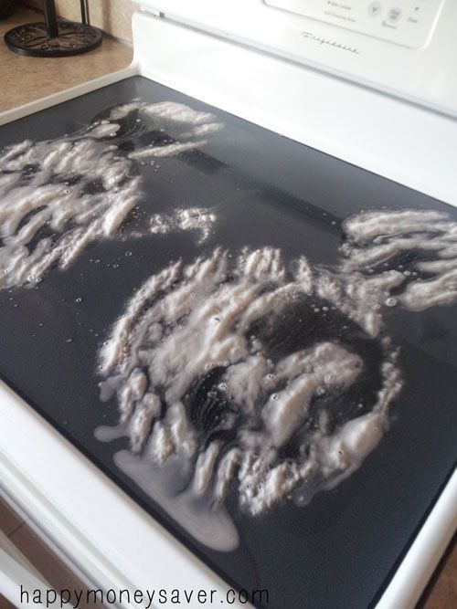 Πρώτα, τρίψτε τους λεκέδες σας με μια σπάτουλα σιλικόνης κάνοντας κυκλικές κίνησεις για να χαλαρώσετε τα υπολείμματα. Στη συνέχεια, αναμείξτε τέσσερις κουταλιές της σούπας μαγειρική σόδα και μία κουταλιά της σούπας ξύδι για να φτιάξετε μια κόλλα. Τοποθετήστε τη πάνω από τους λεκέδες σας και αφήστε τη να μουλιάσει για λίγα λεπτά. Τρίψτε την επιφάνεια με ένα πανί από μικροΐνες, και στη συνέχεια, σκουπίστε τη από πάνω προς τα κάτω με ένα βρεγμένο πανί.