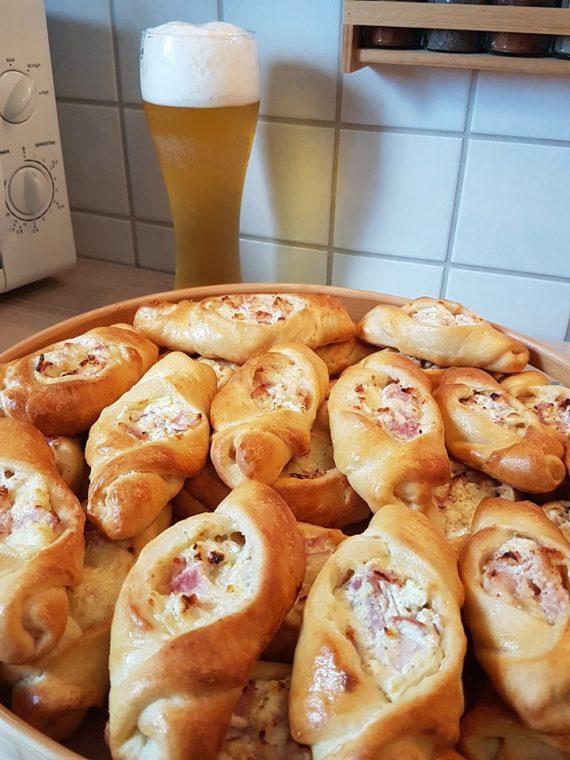 Βάζουμε στο κέντρο τυρί κρέμα μια λωρίδα μπέικον και μια λωρίδα γκούντα. Διπλώνουμε τη μια άκρη πάνω στη γέμιση και την άλλη άκρη την τραβάμε ελαφρώς να φτάσει επάνω και πίσω απο την προηγούμενη.Το ίδιο κάνουμε και στην άλλη μεριά. Μην ανησυχήσετε αν δεν έχουν τέλεια εμφάνιση, θα τα αφήσουμε να φουσκώσουν μέσα στο ταψί και θα γίνουν τέλεια. Αν δυσκολευτείτε στο κλείσιμο,ενώστε απλά τις άκρες τη μια πάνω στην άλλη.