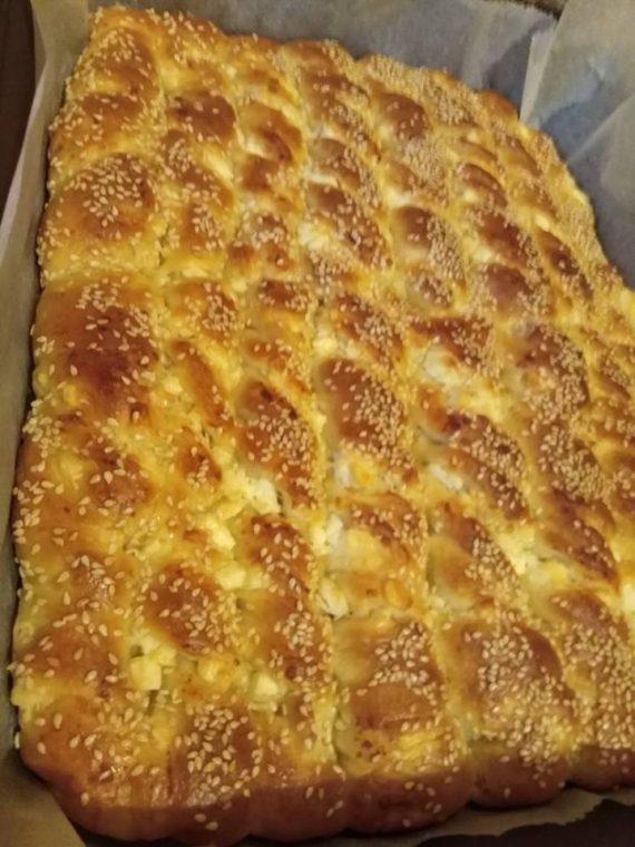 Διαλύω τη μαγιά στο χλιαρό γάλα τα αφήνω 15 λεπτά μετά προσθέτω το ηλιέλαιο το αλάτι τα αυγά ανακατεύω με το σύρμα και στο τέλος τη φαρίνα αφήνω μισή ώρα να φουσκώσει χωρίζω τη ζύμη σε δύο μέρη ανοίγω δύο φύλλα που ενδιάμεσα βάζω την γέμιση κόβω λωρίδες στρίβω αλείφω με αυγό πασπαλίζω με σουσάμι και ψήνω στους 180 για 35 λεπτά