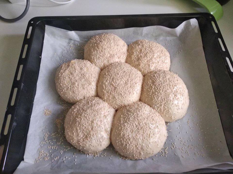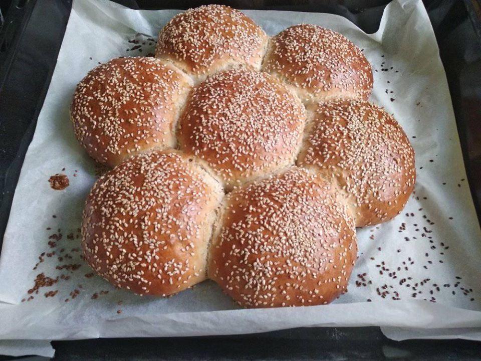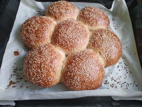 Στο μπολ που θα ζυμώσουμε βάζουμε πρώτα το βραστό νερό με το γάλα ,έπειτα την ζάχαρη και τέλος την μαγιά. Το νερό πρέπει να είναι βραστό και το γάλα κρύο,έτσι θα πετύχουμε την σωστή θερμοκρασία για να μην “κάψουμε” την μαγιά. Προσθέτουμε την μαγιά, ανακατεύουμε ίσα ίσα να ενσωματωθεί η μαγιά στο μείγμα μας, σκεπάζουμε με μεμβράνη και τοποθετούμε σε ζεστό μέρος να αφρίσει το μείγμα. Προσθέτουμε το ελαιόλαδο και προσθέτουμε σιγά σιγά το αλεύρι (Εγώ βάζω 400 γραμμάρια σκληρό αλεύρι για τσουρέκι και 220 γραμμάρια φαρίνα η για όλες τις χρήσεις) χτυπώντας στην μεσαία ταχύτητα του μίξερ έπειτα προσθέτουμε το αλάτι και χτυπάμε μέχρι να γίνει μια ζύμη ομοιογενής και ελαστική περίπου 5 λεπτά σκεπάζουμε με μεμβράνη και το ξανά βάζουμε σε ζεστό μέρος μέχρι να διπλασιαστεί η ζύμη. Περίπου 20-30 λεπτά. Ξεφουσκώνουμε την ζύμη με την γροθιά μας. Χωρίζουμε σε ισοβαρή κομμάτια, πλάθουμε όπως επιθυμούμε και αφήνουμε πάλι να φουσκώσουν 10-15 λεπτά, αφήνουμε λίγο κενό μεταξύ τους γιατί θα φουσκώσουν και πριν μπουν στον φούρνο και όση ώρα ψήνονται. Πασαλείβουμε με το αυγό και πασπαλίζουμε με σουσάμι. Ψήνουμε σε ταψί με λαδόκολλα στους 180 βαθμούς στις αντιστάσεις και στο αερόθερμο μέχρι να πάρει χρώμα από πάνω. Μόλις τα βγάλουμε από το φούρνο τα βάζουμε σε μια σχάρα ή κάπου να κρυώσουν. Αν τα αφήσουμε στο ταψί θα πανιάσουν. Μένει αφράτο ακόμα και 4 μέρες μετά!