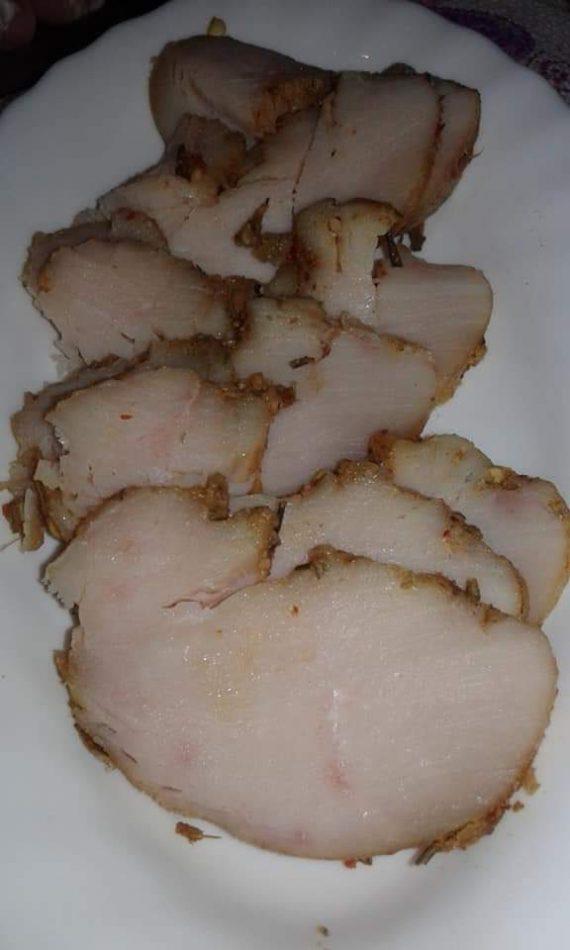 Ψήνω στον αέρα για περίπου 25-30 λεπτά. Γυρίζω και ψήνω και από την άλλη για 30 – 40 λεπτά. Ελέγχω με ένα καθαρό μαχαίρι εάν τρυπιέται το κρέας εύκολα και τότε είναι έτοιμο. Δεν πρέπει να παραψηθεί, γιατί τότε χάνει τη σωστή υφή που πρέπει να έχει το αλλαντικό. Από ότι διάβασα, είναι έτοιμο όταν το θερμόμετρο δείξει 75 βαθμούς στον πυρήνα του κρέατος.