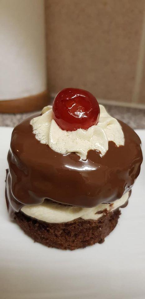 Ενώνουμε με τα υπόλοιπα και ετοιμάζουμε την κουβερτούρα. Μόλις λιώσει ρίχνουμε από πάνω και διακοσμούμε με ότι θέλουμε εγώ έβαλα κερασάκια. Βγαίνουν περίπου 12 μεγάλα παστάκια.