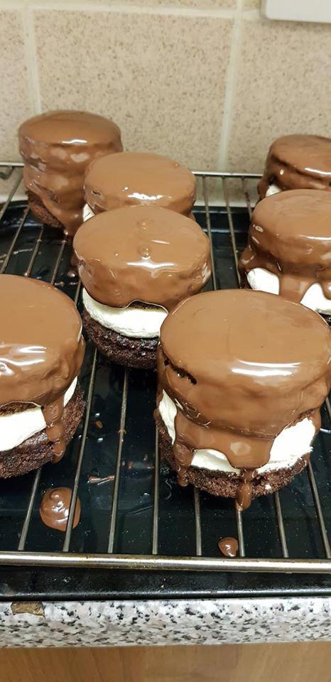 Βάζουμε την κρέμα στο ψυγείο. Κόβουμε τα κεκάκια την μέση και σιροπιάζουμε. Βάζουμε την κρέμα σε σακούλα για κορνέ και βάζουμε στα μισά κεκάκια κρέμα.