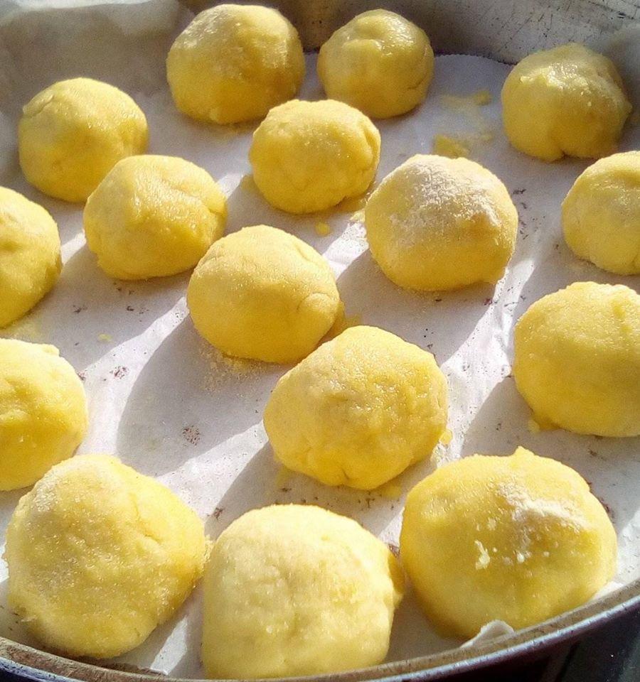 Βάζουμε στο μπολ το αυγό,το χυμό,το γιαούρτι και τα ανακατεύουμε με σύρμα. Ρίχνουμε το σιμιγδάλι, το ξύσμα, την βανίλια και ανακατεύουμε με σύρμα. Τέλος ρίχνουμε το αλεύρι, το μπεικιν σιγά σιγά και ζυμώνουμε. Θέλουμε αφράτη και μαλακή ζύμη. Όποτε πλάθουμε μπαλίτσες και τις τοποθετούμε στην λαδόκολλα στο ταψί. Τα ψήνουμε στους 180 βαθμούς σε προθερμασμένο φούρνο για 25 λεπτά φυσικά ανάλογα τον φούρνο του καθενός.