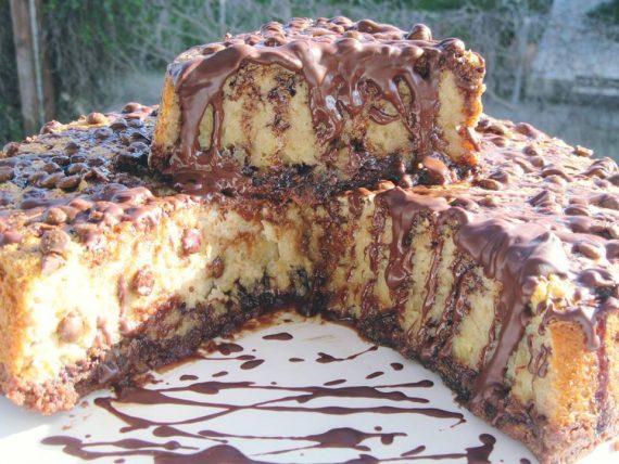 Ετοιμαστε την βαση στρωνοντας την στον πατο μιας φορμας με στεφανη 24-26 εκ καλα βουτυρωμενη!! Χτυπηστε στο μιξερ ολα τα υλικα μαζι εκτος απο τις ψηφιδες σοκολατας Αδειαστε τηνν κρεμα μεσα στην φορμα και πανω στην βαση!!Ριξτε τις ψηφιδες σοκολατες κ ανακατεψτε απαλα!! Ψηστε σε προθερμασμενο φουρνο 160 βαθμους για 1 ωρα κ 15 λεπτα!!Σβηστε τον φουρνο και αφηστε το γλυκο να κρυωσει μεσα σε αυτον!!Ξεφορμαρετε σε πιατελα και σερβιρετε το κρυο!Αν θελετε διακοσμηστε το με σιροπι σοκολατας η 50γρ λυομενη κουβερτουρα ανακατεμενη με κουταλια ηλιελαιο!!