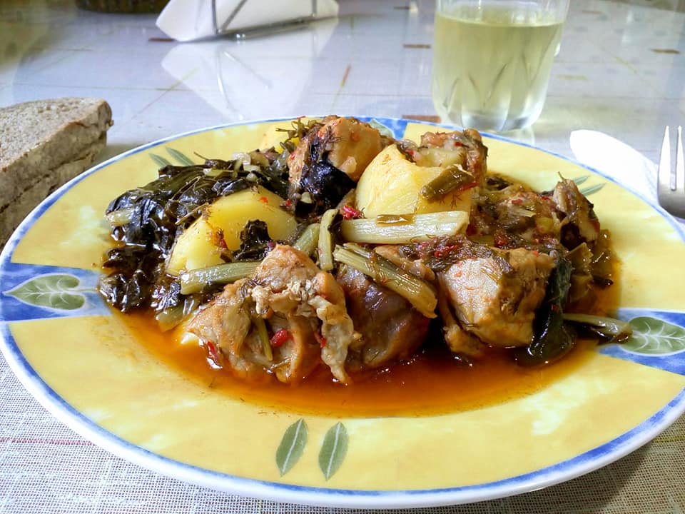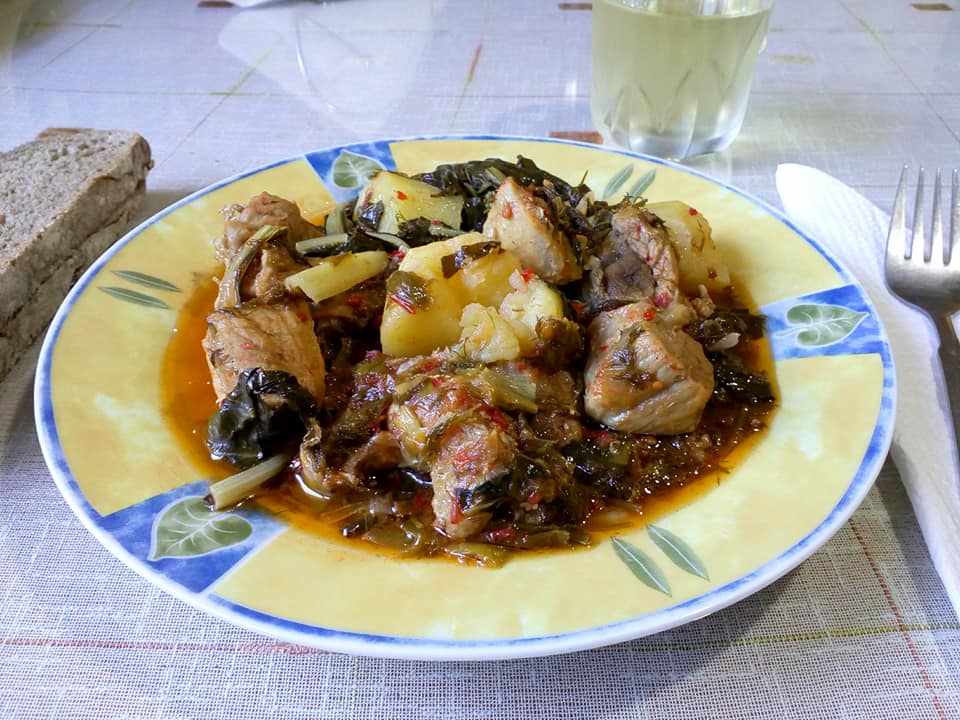 Σοτάρουμε πολύ καλά το κρέας με το ελαιόλαδο, και στη συνέχεια ρίχνουμε ένα ποτήρι νερό και το αφήνουμε να σιγοβράσει για 20 λεπτά. Προσθέτουμε το πράσο,το μάραθο από την κατάψυξη, Και το αφήνουμε να ψηθεί για κανένα δεκάλεπτο ακόμα. Στη συνέχεια προσθέτουμε τη τριμμένη ντομάτα, και σάλτσα ντομάτας αν χρειάζεται. Συνεχίζουμε το ψήσιμο για άλλα 10 λεπτά στη συνέχεια προσθέτουμε 2 μέτριες πατάτες κομμένες και τα σέσκουλα εμείς εδώ στην Κρήτη τα λέμε Γούλα και αφήνουμε να σιγοψηθεί μέχρι να μελώσει η πατατούλα και να μείνει με το λαδάκι του. Είναι ένα φαγητό πολύ μυρωδάτο πολύ νόστιμο και το φτιάχνουμε πολύ το χειμώνα και όλη την άνοιξη που έχουμε τα ωραία μυρωδάτα χορταράκια.