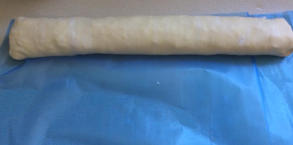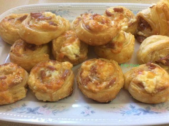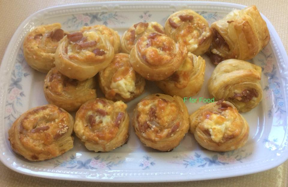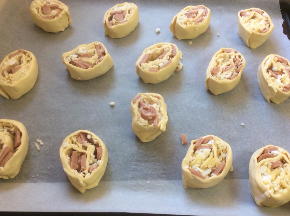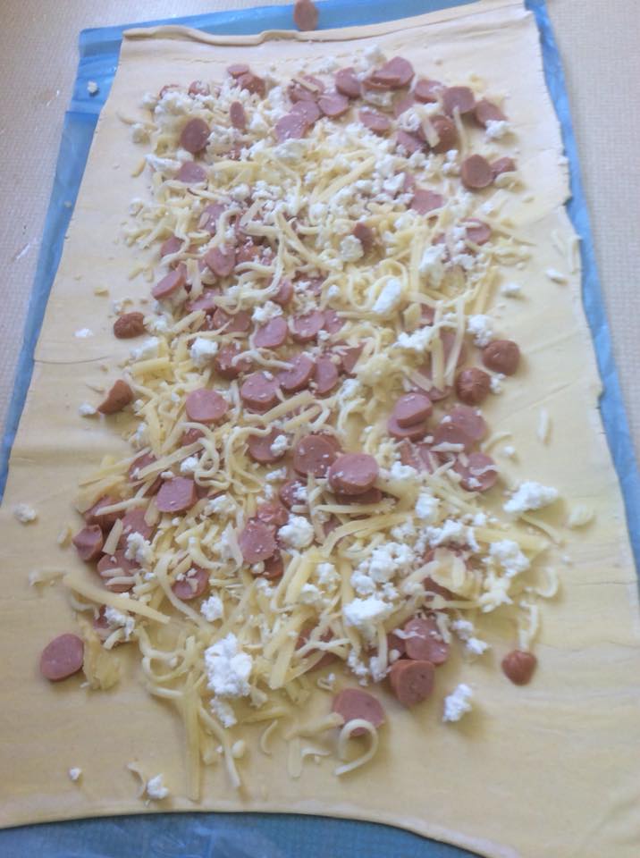 Άνοιξα καλά το φύλλο με τον πλάστη.Έβαλα τα υλικά γέμισης και έκλεισα το φύλλο,όπως στην φωτογραφία. Το έκοψα φέτες,τις οποίες έβαλα σε λαδόκολλα και πασάλειψα με αυγό και σουσάμι. Έψησα στους 220 βαθμούς στις αντιστάσεις για περίπου, μίση ώρα μέχρι να πάρουν χρώμα. Μπορείτε αντί για λουκάνικα να βάλετε ζαμπόν ή γαλοπούλα.