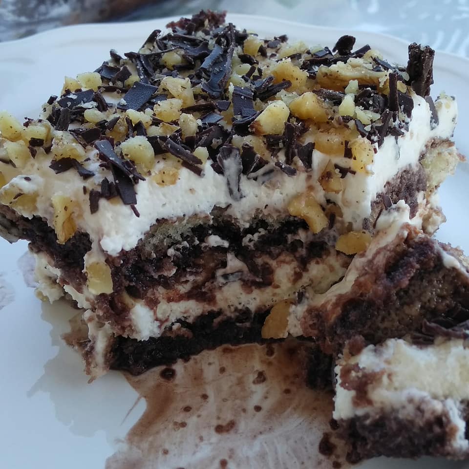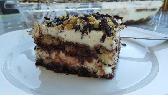 Για την κρέμα με το μασκαρπόνε…..αφρατευω αρχικά το τυρί κρέμα με τη ζάχαρη και προσθέτω σταδιακά την κρέμα γάλακτος. Χτυπάω μέχρι να γίνει μια ωραία σφιχτή κρεμούλα!!! Συναρμολόγηση Βρέχω τα σαβαγιαρ στο σιρόπι κακάο και κάνω μια στρώση ,προσθέτω τη μισή κρέμα , τα μισά καρυδιά σοκολάτα και κάνω άλλη μια στρώση σαβαγιαρ, κρέμα, σοκολάτα, και καρύδια. Βάζω στο ψυγείο να παγώσει καλά.