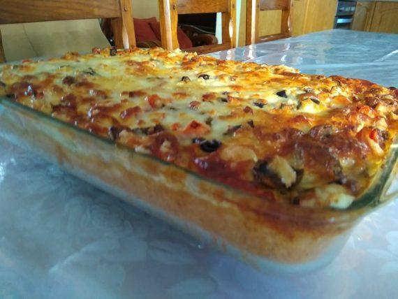 Κτυπαμε τα αυγά μας προσθέτουμε το γάλα και το περιχυνομαι πάνω στην πίτσα μας. Την ψήνουμε στους 170′ για 40′-45′.