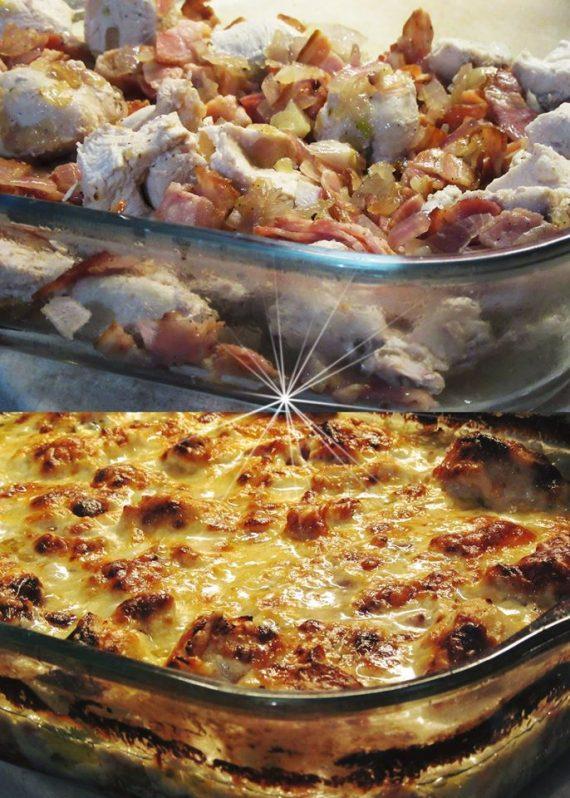 Κόβουμε το κοτόπουλο σε μπουκιές, το βράζουμε σε αλατισμένο νερό για δέκα λεπτά, Το στραγγίζουμε και τοποθετούμε σε ένα ταψί,σε τηγάνι τσιγαρίζουμε το μπέικον τα κρεμμύδια,τα ρίχνουμε πάνω στο κοτόπουλο και τα ανακατεύουμε όλα μαζί να πάνε παντού,ρίχνουμε λίγο αλάτι και πιπέρι,προσθέτουμε την κρέμα γάλακτος ρίχνουμε την μια κούπα τυρί μέσα και ανακατεύουμε, Με την άλλη κούπα τυρί πασπαλίζουμε από πάνω ψήνουμε στους 200 βαθμούς μέχρι να ροδίσει και να δέσει η σάλτσα..!!