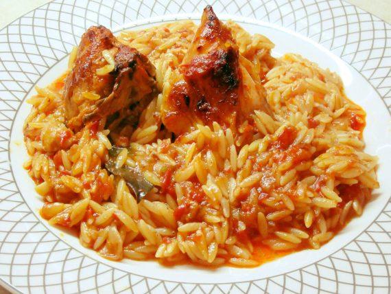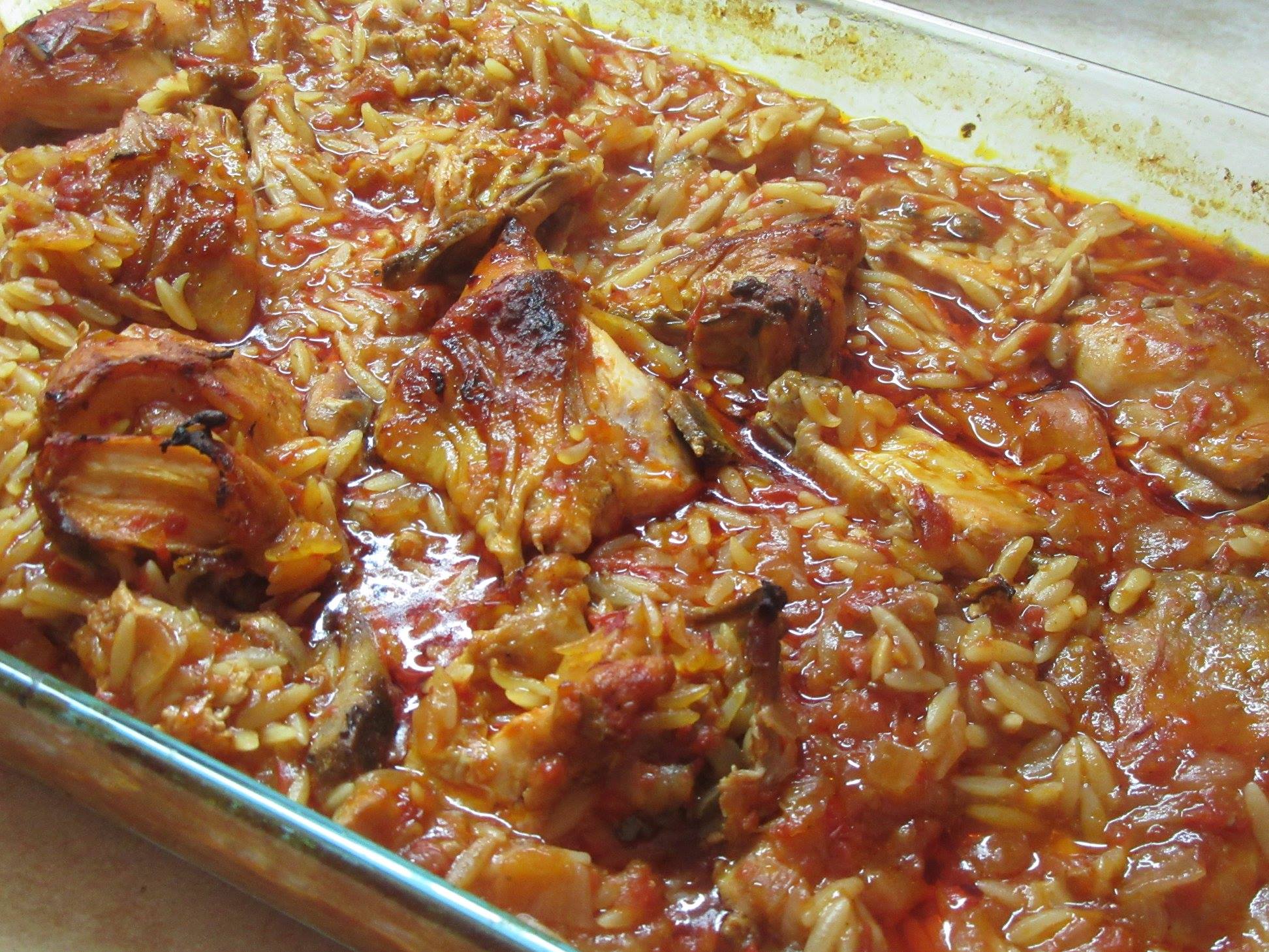 Τσιγαρίζω το κοτόπουλο με λίγο ελαιόλαδο και δυο μεγάλα κρεμμύδια, σβήνω με μισό ποτήρι του κρασιού κρασί λευκό, μετά ρίχνω αλάτι πιπέρι 2 μπαχάρια 2 δαφνόφυλλα σπιτική σάλτσα και μια κουταλιά σούπας πελτέ πολύ λίγο κανέλα και νερό.. Μόλις βράσει το κοτόπουλο προθερμαίνω τον φούρνο, ρίχνω αρκετό νερό μεσα στην κατσαρόλα κ αφήνω να πάρει βράσει βάζω το κοτόπουλο σε πυρέξ και ρίχνω το καυτό ζουμί. Μετα ρίχνω και κριθαράκι μέτριο μέσα στο πυρέξ 1 πακέτο περίπου .. δλδ 500 γρ ανακατεύω μια φορά και βάζω στο φούρνο στου 220 μέχρι να ψηθεί… Μέχρι το τέλος ανακατεύω 3 -4 φορές αφήνω περίπου 25 λεπτά ..στο τέλος σβήνω και αφήνω λίγο να κρατάει.. μέχρι να σερβίρω για να φάμε φουσκώνει και χυλώνει από μόνο του..! !Το πυρέξ η το ταψί σας να είναι μεγάλο.