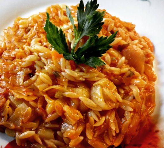 Ρίχνω μία συσκευασία ντομάτα στον τρίφτη, φρέσκο τριμμένο πιπέρι, αλάτι,σελινο ψιλοκομμένο, ζεστό νεράκι και τα αφήνω μέχρι να μαλακώσουν τα πράσα μου. Όταν είναι έτοιμο το ρίχνουμε σε όπως είναι όλο στο ταψί του φούρνου. Στην ίδια κατσαρόλα βάζω λίγη φυτίνη και τσιγαριζω για 2-3′ ένα πακέτο κριθαράκι. Το ρίχνω και αυτό μέσα στο ταψί.