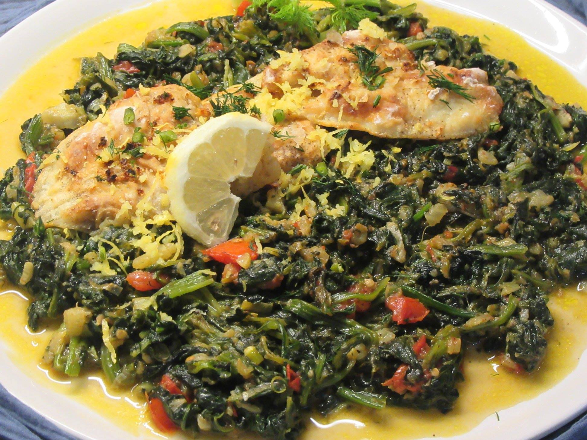 Πρωτα ετοιμαζετε το σπανακι!! Ζεσταινετε το μισο ελαιολαδο στο τηγανι κ σοταρετε ελαφρα τα κρεμμυδακια με το φινοκιο ισα να μαλακωσουν ..!!!Προσθετετε το σπανακι κ ανακατευοντας μεχρι να μαλακωσει και να χασει τον ογκο του..!!! ριχνετε και τα κυβακια ντοματας τον ανηθο το αλατι και το πιπερι και το υπολοιπο ελαιολαδο..!!!Αφηνετε να βρασει μεχρι να χαθουν τα υγρα του και το βαζετε μεσα σε σαλατιερα !!!Βαλτε αλατι στις γλωσσες ..ανακατεψτε λιγο αλευρι με το ξυσμα του λεμονιου κ αλευρωστε τις γλωσσες ..βαλτε επανω σε λαδοκολλα κ ψηστε στο γκριλ του φουρνου μεχρι να ροδισουν ..σερβιρετε με το σπανακι!!!