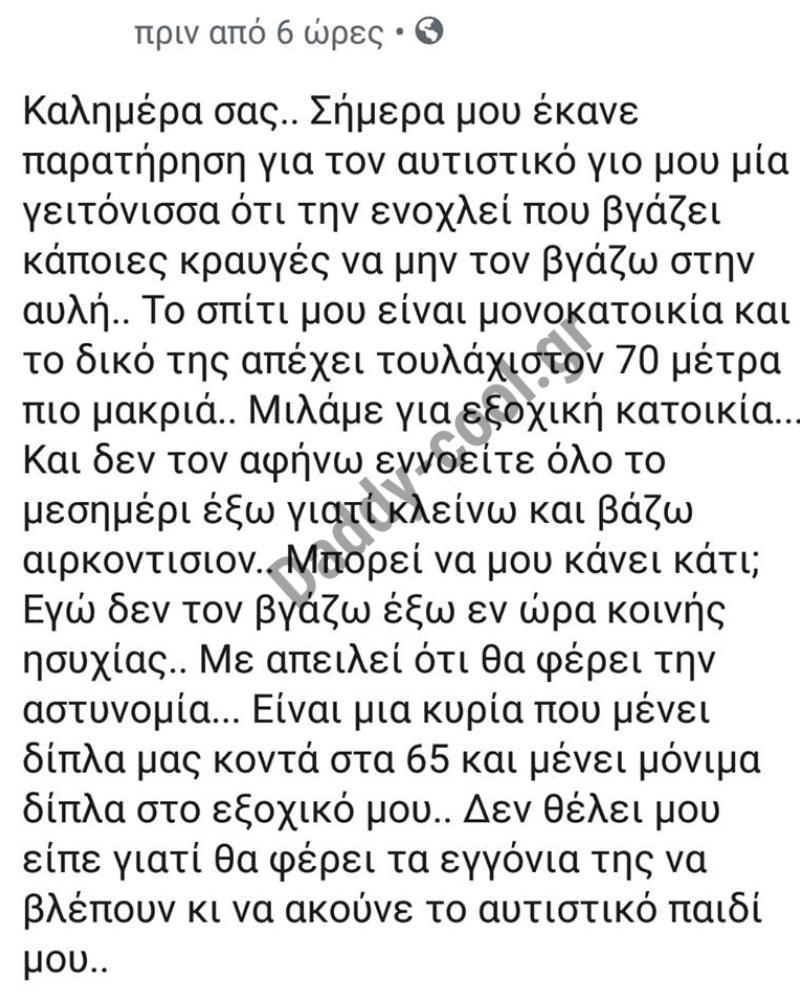 Να της πεις κατάμουτρα ότι είναι και κακή γειτόνισσα, αλλά ακόμα περισσότερο κακός και επικίνδυνος άνθρωπος! Πως αν ήσουν νύφη της, δεν θα τις έδινες ποτέ μα ποτέ να κρατήσει τα εγγόνια σου γιατί δεν είναι και καλή γιαγιά . Ένας άνθρωπος με κόμπλεξ και λανθασμένες αντιλήψεις χωρίς ευαισθησίες, ειδικά για παιδιά με ειδικές δεξιότητες , δεν είναι άνθρωπος . Ο αυτισμός δεν είναι ντροπή, ντροπή είναι που υπάρχουν άνθρωποι με αυτά τα μυαλά στην εποχή μας. Μην μπεις στο τρυπακι κορίτσι μου να ασχοληθείς ούτε να μπεις στην διαδικασία να φοβάσαι να βγάλεις το παιδί σου βόλτα. Κρίμα ρε κοριτσάκι μου που δεν είμαστε κοντά σας…κρίμα!
