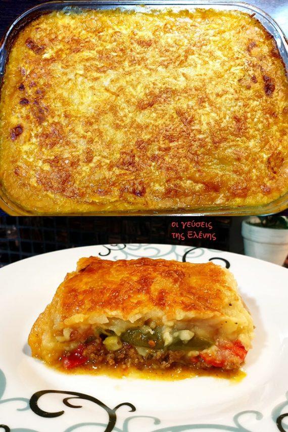 Στήσιμο… Σε ένα πυρεξ στρώνουμε Τον κιμά… Ρίχνουμε λίγο από τα τυριά… στρώνουμε τα λαχανικά… λίγο από τα τυριά… Τον πουρέ και τελειώνουμε με τυριά… ψήνουμε σε προθερμασμένο φούρνο στους 170° στον αέρα για περίπου 40 λεπτά…