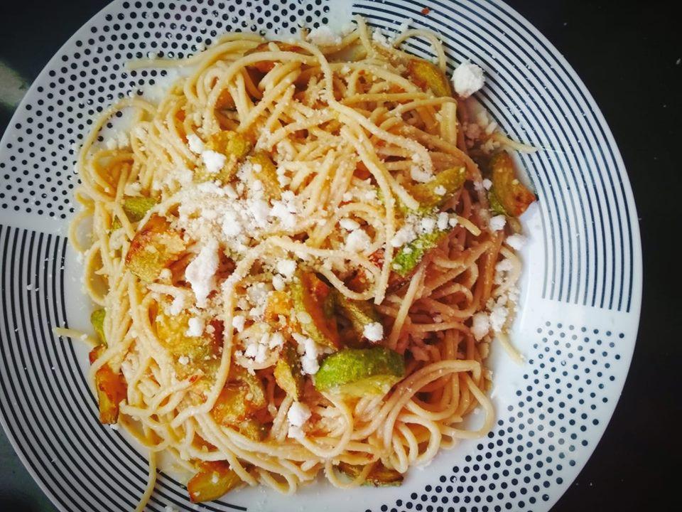 Αφού αρχίσουν να παίρνουν χρώμα τα κολοκυθάκια, ρίχνω μερικές σκελίδες σκόρδο και τις τριγυρίζω, να δώσουν άρωμα. Έπειτα ρίχνω στο τηγάνι τα έτοιμα μακαρόνια και δυόσμο ή βασιλικό. Μόλις “γυαλισουν”, σερβίρω και ρίχνω από πάνω το τριμμένο τυρί.