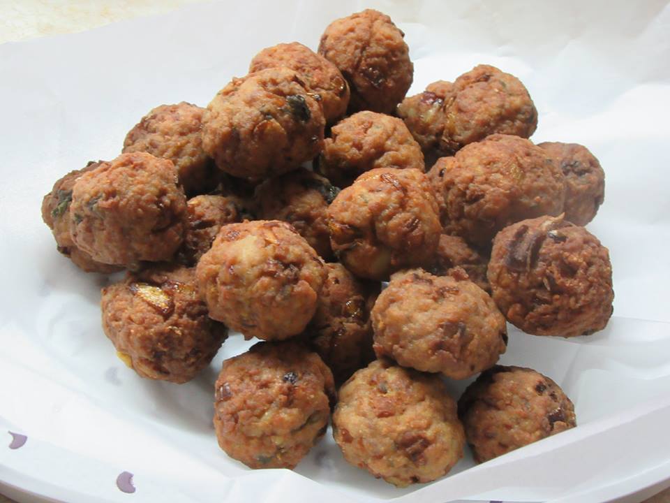 Ανακατέψτε όλα τα υλικά μαζί, αφήστε στο ψυγείο για μισή ώρα, κάντε μπαλάκια αλευρώστε τα και τηγανίστε τα σε βαθύ σκεύος και σε μπόλικο αραβοσιτέλαιο. Συνοδέψτε με πατάτες τηγανητές.