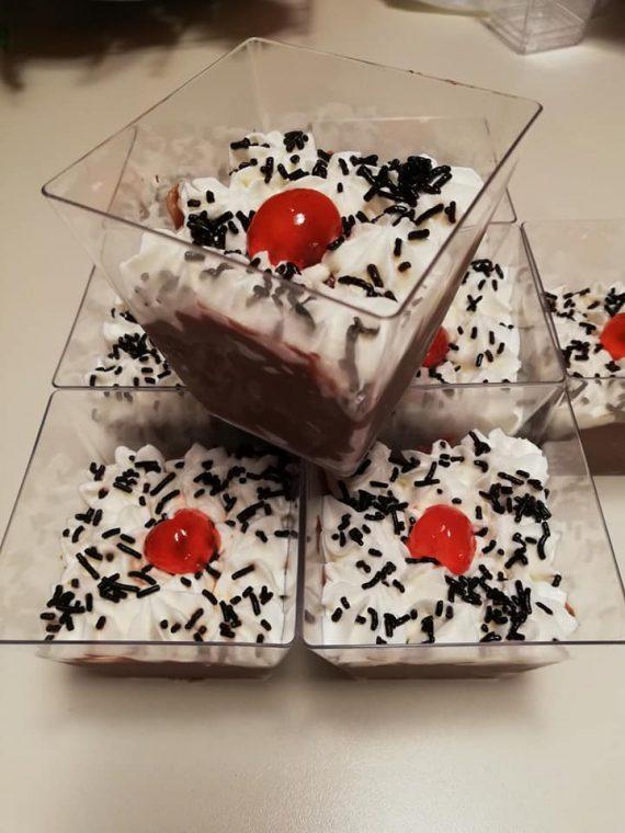 1λίτρο γάλα 200γρ.κουβερτούρα 8κ.σ.ζάχαρη 125γρ.βούτυρο 2κ.σ.κακάο 100γρ.άνθος αραβοσίτου Λίγο γάλα για να διαλυθεί το άνθος και το κακάο 2 πακέτα μπισκότα πτιμπερ 1 κουτί φυτική σαντιγί,κερασάκια,τρούφα