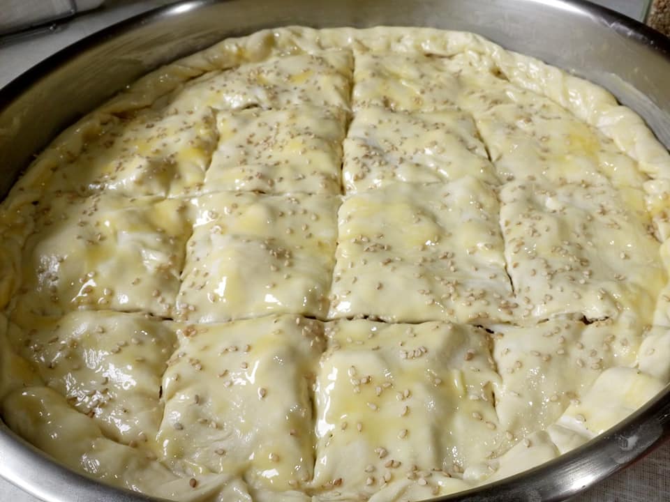 ανοίγουμε και το άλλο φύλλο καλύπτουμε την πίτα μας φτιάχνουμε γύρω-γύρω τον κόθρο, βουτυρώνουμε πασπαλίζουμε με λίγο σουσάμι προαιρετικά, και ψήνουμε στους 180 βαθμούς για 50 έως 60 λεπτά αναλόγως το φούρνο. Έγινε πολύ νόστιμη και το φύλλο αφράτο και τραγανό ποίημα.