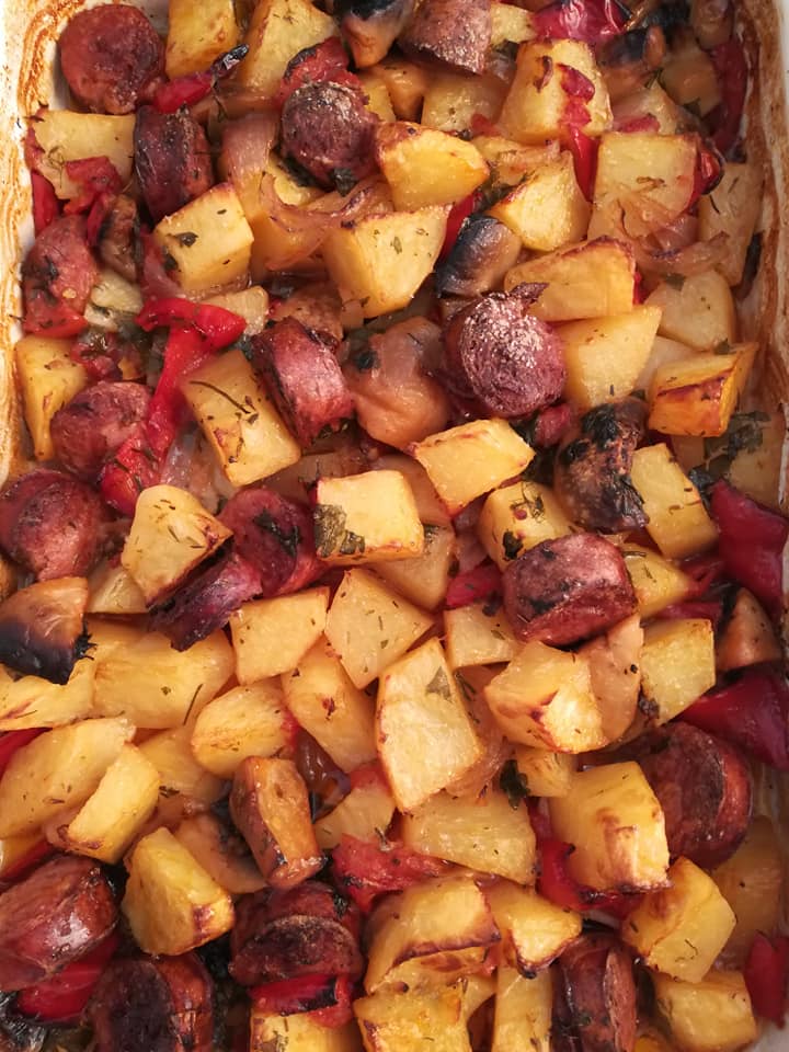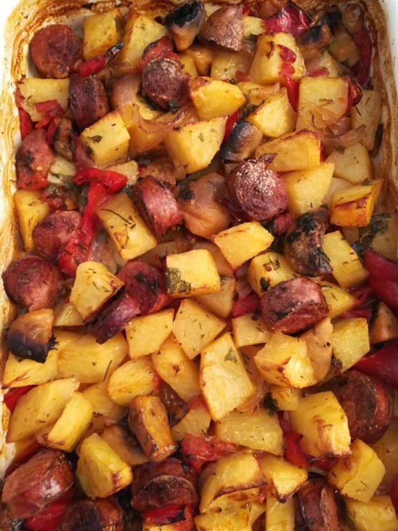 Λουκάνικα στο φούρνο με διάφορα λαχανικά, πατάτες και θυμάρι. Εύκολη και γρήγορη συνταγή με λουκάνικο για αρχάριους ή για όταν δεν έχετε χρόνο για μαγείρεμα. Γίνεται πραγματικά πολύ νόστιμο και χορταστικό και μυρίζει υπέροχα όλο το σπίτι! Δοκιμάστε το για μεσημεριανό ή και βραδινό!