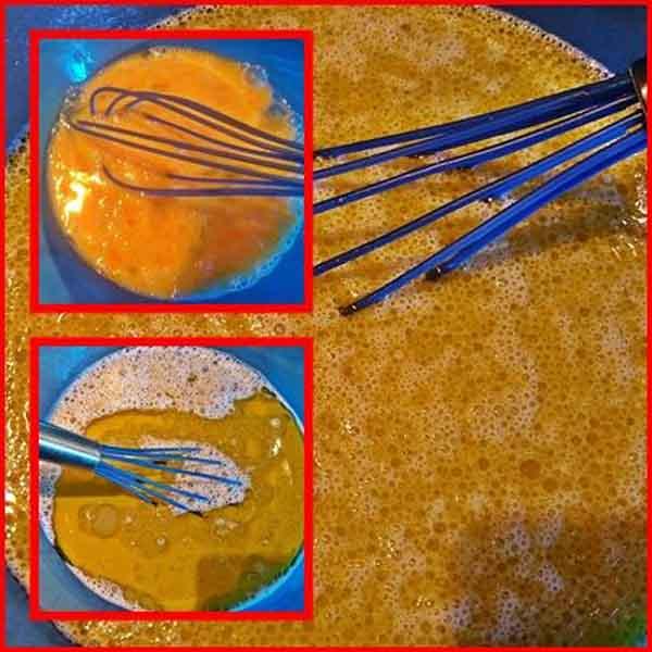 Σε ένα άλλο μπολ, χτυπάμε τα αυγά ένα – ένα, προσθέτουμε το γάλα και το ελαιόλαδο και τα ανακατεύουμε μέχρι να ομογενοποιηθούν τα υλικά.