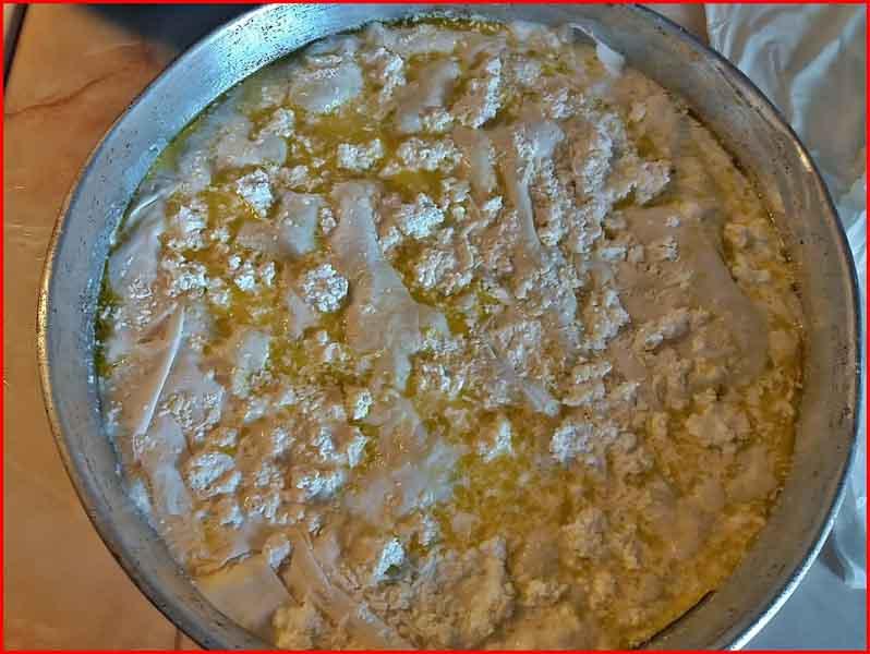 και περιχύνουμε 1-2 κουτάλες από το μείγμα τον αυγών με το γάλα και το ελαιόλαδο