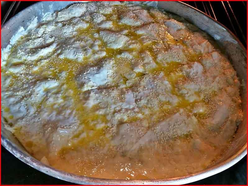 Στρώνουμε το τρίτο φύλλο και συνεχίζουμε την ίδια διαδικασία (τυριά – αυγά, γάλα, λάδι, φύλλο) μέχρι να τελειώσουν τα τυριά. Προσέχουμε στο τέλος να μας μείνει λίγο από το υγρό μείγμα για να το περιχύσουμε πάνω στην πίτα. Τέλος, καλύπτουμε την πίτα με δύο φύλλα και γυρίζουμε τις άκρες που τυχόν εξέχουν από το ταψί. Χαράζουμε την πίτα σε κομμάτια και περιχύνουμε το υπόλοιπο υγρό μείγμα να πάει παντού. Την αφήνουμε να σταθεί για περίπου 10 λεπτά, ώστε να απορροφηθεί λίγο το υγρό μείγμα. Πασπαλίζουμε με σουσάμι και ψήνουμε για περίπου 1 ώρα.)
