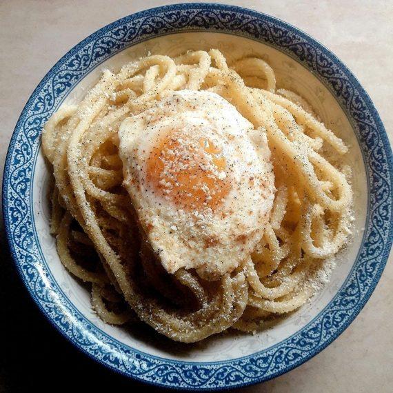 Βράζουμε τα μακαρόνια σε αλατισμένο νερό στραγγίζουμε και τα βάζουμε πάλι στη κατσαρόλα.Ριχνω σε τηγάνι 5 κουταλιές σούπας βούτυρο,μόλις λιώσει ρίχνω 6 κουτ.σουπας μυζήθρα και ανακατεύω απαλά μέχρι να πάρει λίγο χρυσαφί χρώμα(οχι να καεί γιατί θα πικρισει). Καυτό όπως είναι το ρίχνω στα μακαρόνια και ανακατεύω απαλά. Στο ίδιο τηγάνι ξαναριχνω μία κουταλιά βουτύρο και τηγανιζω τα αυγά να είναι μελατος ο κρόκος.