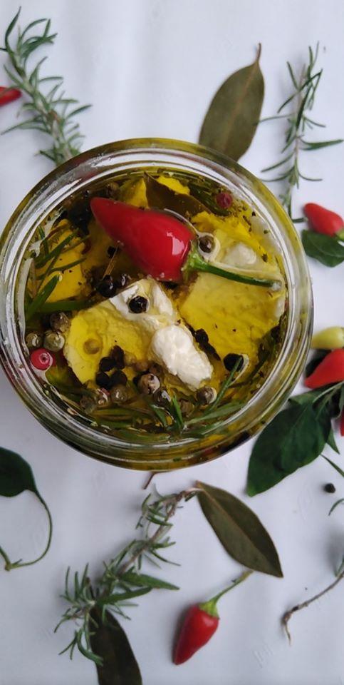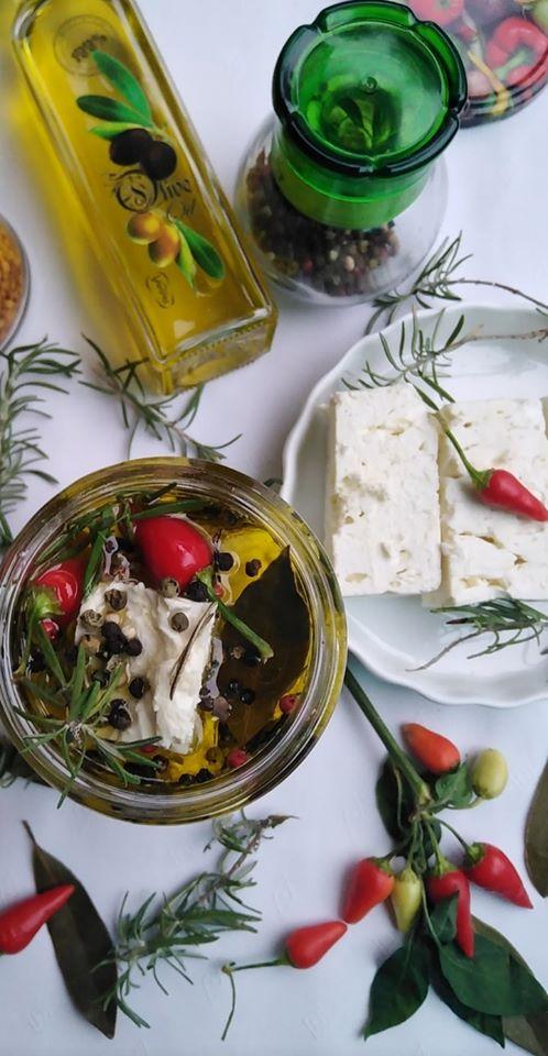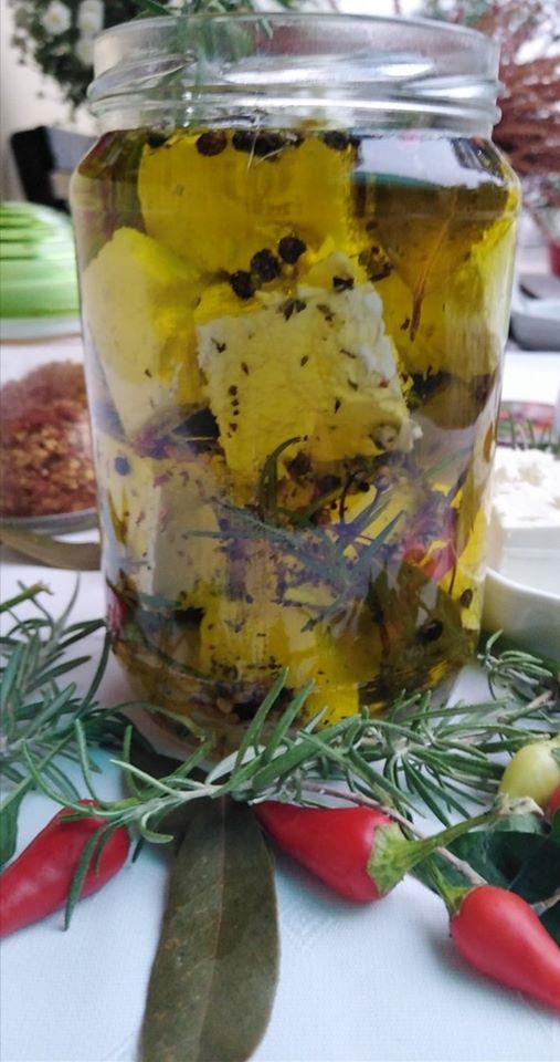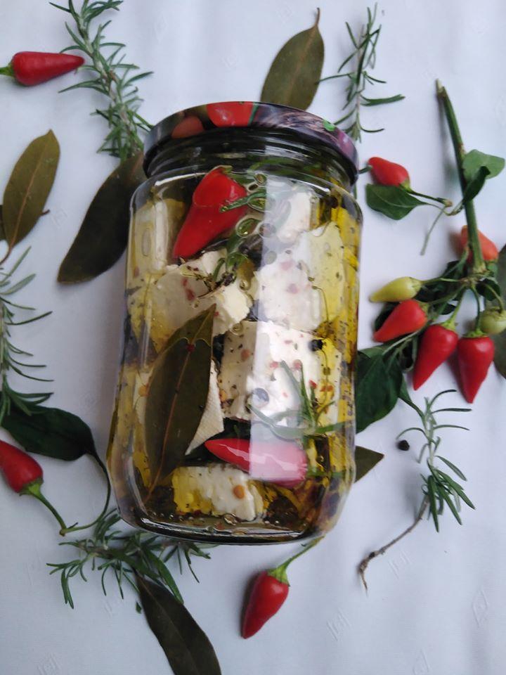 Κόβουμε τη φέτα σε κύβους,(ανάλογα με το βάζο που θα χρησιμοποιήσουμε) και την βάζουμε στο βάζο, συμπληρώνοντας με το λάδι μισό ελαιόλαδο, μισό καλαμποκέλαιο, τα μπαχαρικά, όπως πιπερίτσες καυτερές, φρέσκο τριμμένο πιπέρι, ρίγανη, φύλλα δάφνης, θυμάρι, δεντρολίβανο, κόκκους μπαχαρι. Τα μπαχαρικά και το λάδι στο τυρί τα βάζουμε σε στρώσεις για να αρωματιστούν ομοιόμορφα και φροντίζουμε να καλύπτετε με λάδι το τυρί. Σερβίρουμε την φέτα την ίδια κιόλας ημέρα και την διατηρούμε στο βάζο στο ψυγείο για ένα μήνα.