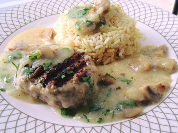 8ΟΟγρ Μοσχαρίσιο κιμά ελιά!! 1 Κρεμμύδι μεγάλο 1Κουτ σούπας ρίγανη 4Κουτ σουπας ελαιολαδο 1 Αυγο 6 φρυγανιες τριμμένες 3 Κουτ σουπας μαιντανο 3 κουταλιες σουπας τυρι τριμμένο σκληρό Δανιας Αλατι ,πιπερι! Λιώστε το κρεμμύδι και τις φρυγανιές στο μπλέντερ ανακατέψτε με τον κιμά όλα μαζί τα υλικά και αφήστε το μείγμα στο ψυγείο για μια ώρα να ξεκουραστεί ..πλαστέ και ψήστε 5 λεπτά από την μια και άλλα 5 από την άλλη!! Υλικά για την σάλτσα!!! 2 κ.σ. βούτυρο αγελαδος 200 γρ. φρέσκα μανιτάρια, κομμένα σε φέτες 1 σκελίδα σκόρδο, πολτοποιημένη 3 κουταλιές σούπας κορν φλάουρ 3 φλ. τσαγιού ζωμό βοδινού Μαϊντανό και φρεσκοτριμμένο πιπέρι για γαρνίρισμα !!!