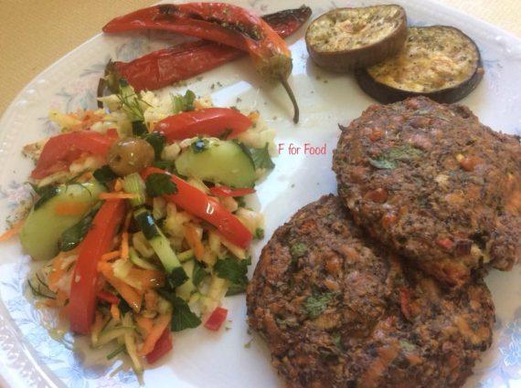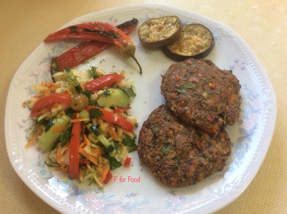 Εψησα σε λαδοκολα ,μελιτζανες πασαλειμενες με ελαιολαδο,ψιλοκομενο σκορδο,ριγανη,αλατοπιπερο. Επισης εψησα και λιγες πιπεριες. Ετοιμασα και μια σαλατα με λαχανο,τριμενα κολοκυθι και καροτο,αγγουρι,τοματα,μαιντανο,δυοσμο,κρεμυδακι φρεσκο,σκορδο. Βγηκαν 5 μπιφτεκια.