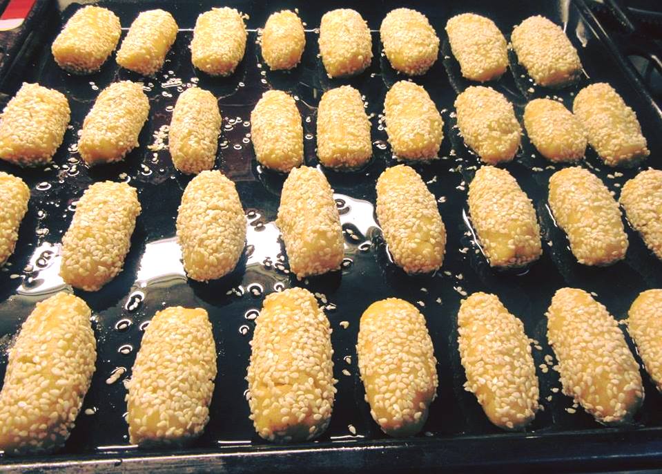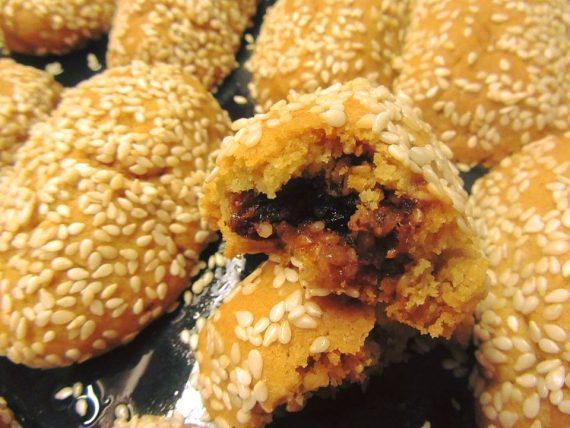 Ετοιμάζετε την γέμιση..Χτυπήστε στο μπέντερ τις σταφίδες τα καρυδιά το καβουδρισμένο σουσάμι,Αρωματίστε το μείγμα με το κανελογαρύφαλλο και το ξύσμα πορτοκαλιού και προσθέστε και το μέλι αραιωμένο με το ζεστό νερό Αν θέλετε μπορειτε να αντικαταστήσετε τα καρύδια με μια κούπα ασπρισμένα και καβουρδισμένα αμύγδαλα. Για την ζύμη Χτυπήστε το λάδι στο μιξερ για μερικά λεπτά,προσθέστε την ζάχαρη και συνεχίστε για 5 λεπτά ακόμα,διαλύστε την μαγειρική σόδα μέσα στον χυμό πορτοκαλιού και τα ρίχνετε μέσα στο μίξερ καθώς και την ρακή..Ανακατεύεται το μπεικιν παουντερ με το αλεύρι και το ρίχνετε σταδιακά μέσα στο μείγμα του λαδιού..Η ζύμη πρέπει να είναι μαλακή και εύπλαστη Παίρνετε μπαλίτσες τις βάζετε στην παλάμη σας και ανοίγεται μικρές πιτούλες Με ενα κουταλάκι βάζετε στην μέση λίγη γέμιση, κλείνετε ομοιόμορφα και οβάλ ρολάρετε μέσα στο σουσάμι βάζετε σε καλα λαδωμένο ταψί η πάνω σε λαδόκολλα.. Ψήνετε σε προθερμασμένο φούρνο σε αντιστάσεις 15 με 20 λεπτά μέχρι να ροδίσουν..!! Ξέχασα να πω ότι μπορειτε να βάλετε και τα μισά υλικά, εκτός από την σόδα ολόκληρο το κουταλάκι και το μπεικιν γιατί βγαίνουν πολλά!!