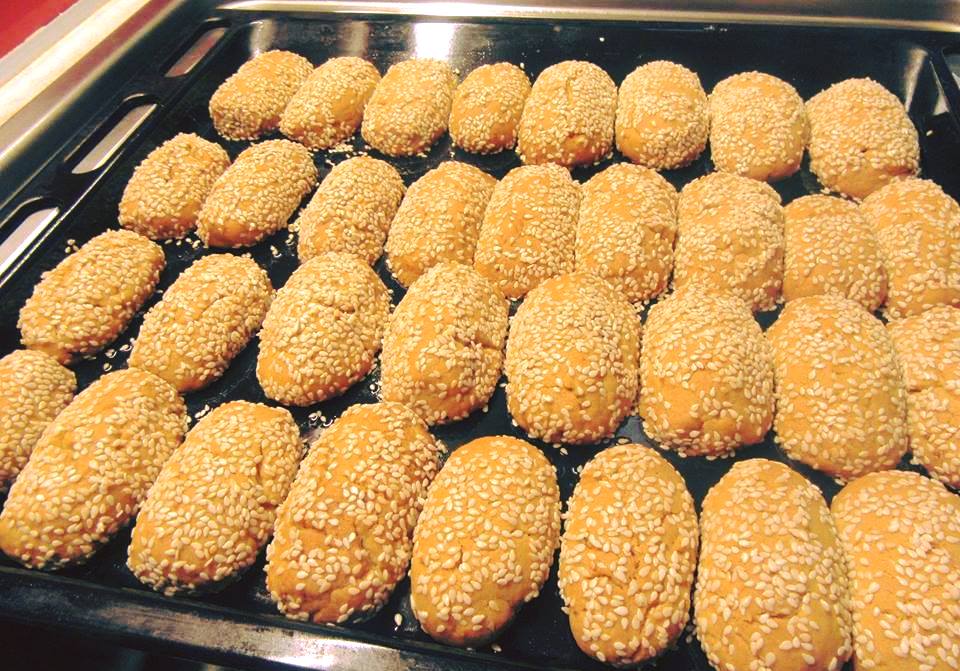 2 Κούπες λάδι 1 κούπα ζάχαρη 1 κούπα χυμό πορτοκάλι 1/4 κούπας ρακή 1 κουταλάκι μαγ σόδα 1κουτ μπεικιν παουντερ ξύσμα από ένα πορτοκάλι σουσάμι για το πασπάλισμα Αλεύρι 6-7 κούπες μαλακό η για όλες τις χρήσεις