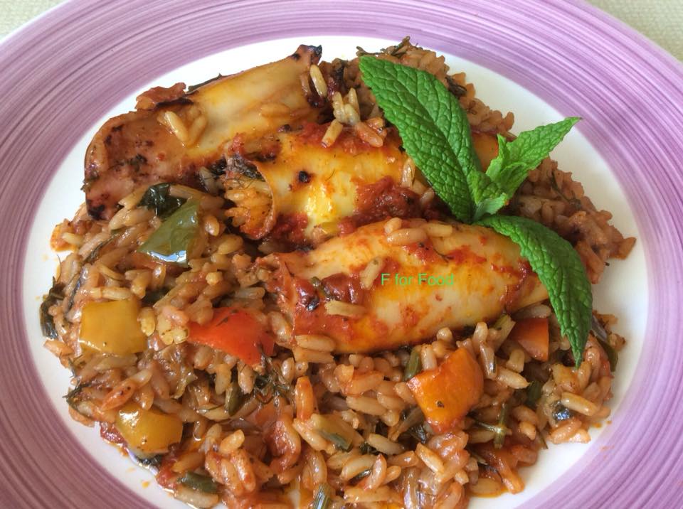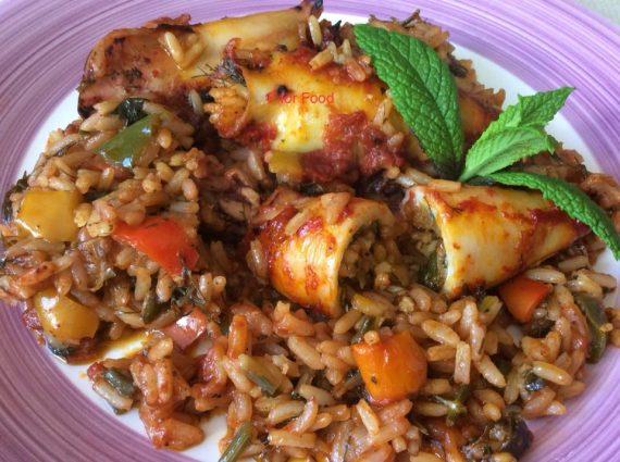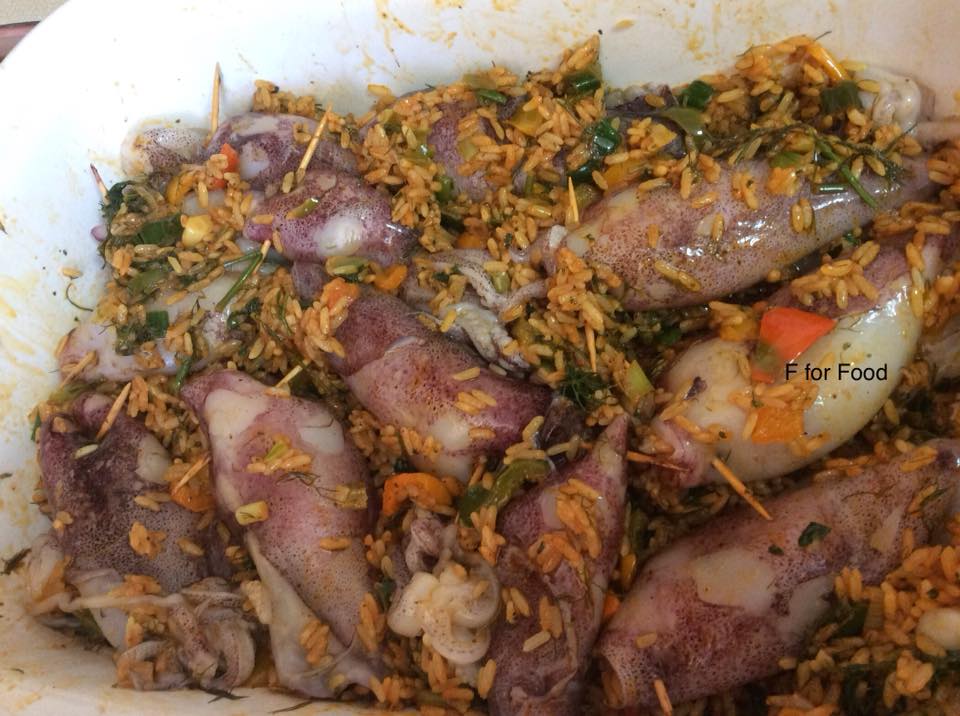 Είχα λίγα καλαμαράκια, τα καθάρισα κράτησα τα μουστάκια και τα έκοψα κομμάτια για την γέμιση. Σόταρα σε ελαιόλαδο τα φρέσκα ψιλοκομμένα κρεμμυδάκια, το μισό φλιτζάνι ψιλοκομμένες πιπεριές, το μαϊντανό, το μυρώνι, το δυόσμο και τα μουστάκια από τα καλαμάρια. Πρόσθεσα το ρύζι και έσβησα με ούζο. Μέτα έβαλα την τριμμένη ντομάτα, λίγο πελτέ και λίγο νερό και τα άφησα να πάρουν δυο βράσεις. Γέμισα τα καλαμάρια, τα έκλεισα με οδοντογλυφίδες και όση γέμιση περίσσεψε την έβαλα στο πυρέξ και τοποθέτησα επάνω, αναπαυτικά, τα γεμισμένα καλαμάρια. Έριξα αλατοπίπερο, λίγο κουρκουμά, δυο κούπες νερό και το σκέπασα με αλουμινόχαρτο. Το έψησα στους 200 βαθμούς, στις αντιστάσεις για περίπου μίση ώρα, μετά έβγαλα το αλουμινόχαρτο και το άφησα να πάρει λίγο χρώμα. Δοκίμασα και χρειάστηκε να προσθέσω λίγο νερό ακόμα.