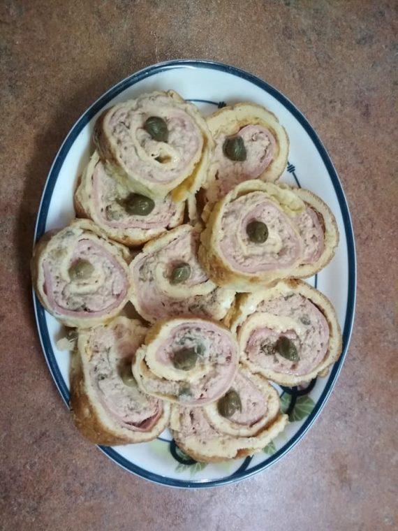 Χτυπάτε τα αυγά και ανακατεύετε πρώτα καλά το αλεύρι (καλύτερα περάστε το από σουρωτηρι. Αν σβωλιασει λίγο δεν πειράζει). Προσθέτετε τα υπόλοιπα υλικά. Τηγανιζετε με λίγο ελαιόλαδο ή βούτυρο σε μεσαίο τηγάνι το μισό μείγμα. Τοποθετείτε την ομελέτα πάνω σε αλουμινοχαρτο. Φτιάχνετε και την 2η ομελέτα. Πάνω στην κάθε ομελέτα απλώνετε 1,5 φέτα ζαμπόν και το μείγμα της γεμισης. Μην απλωσετε μέχρι πάνω γιατί στο τυλιγμα θα χυθεί έξω. Τυλιγετε τα ρολά (όχι πολύ σφιχτά) και τα κλείνετε καλά με το αλουμινοχαρτο. Βάζετε στο ψυγείο για μερικές ώρες να σφιξουν ή στην κατάψυξη για 30′. Κόβετε τα ρολά σε φετουλες. Βάζετε μια καπαρη αν θέλετε για στολισμα. (εάν τα θέλετε πιο πικαντικα, προσθέστε στη γεμιση λίγο πιπέρι καγιεν).