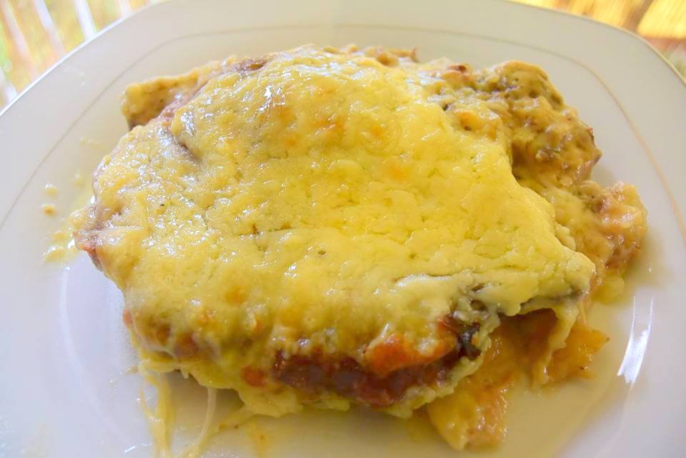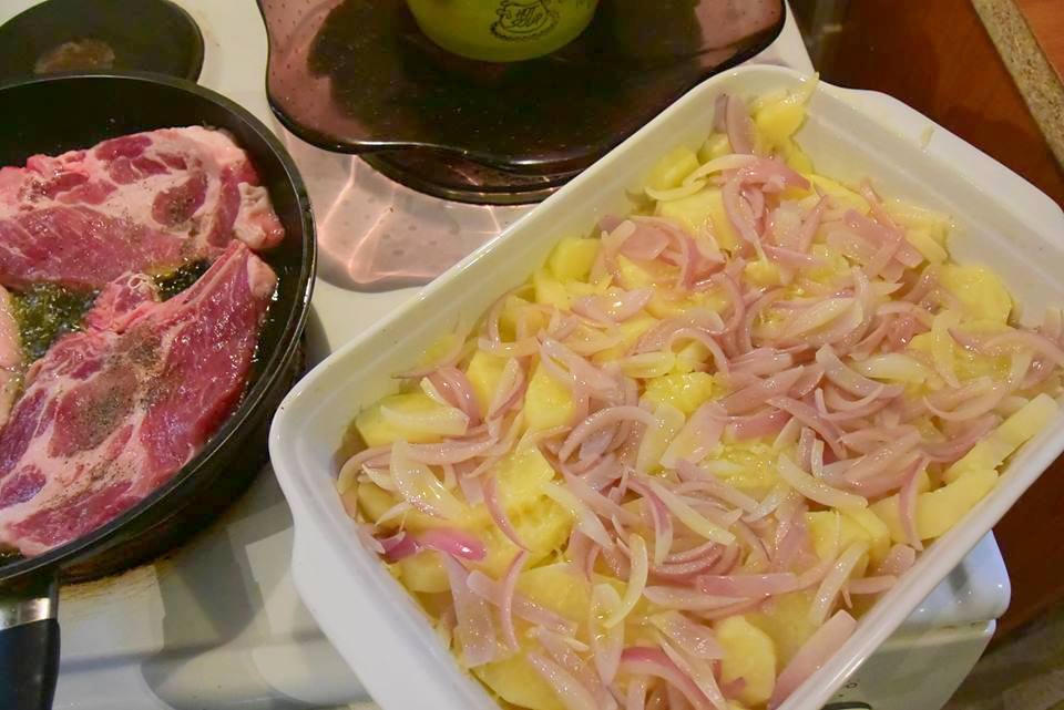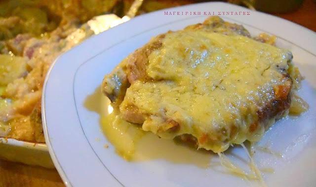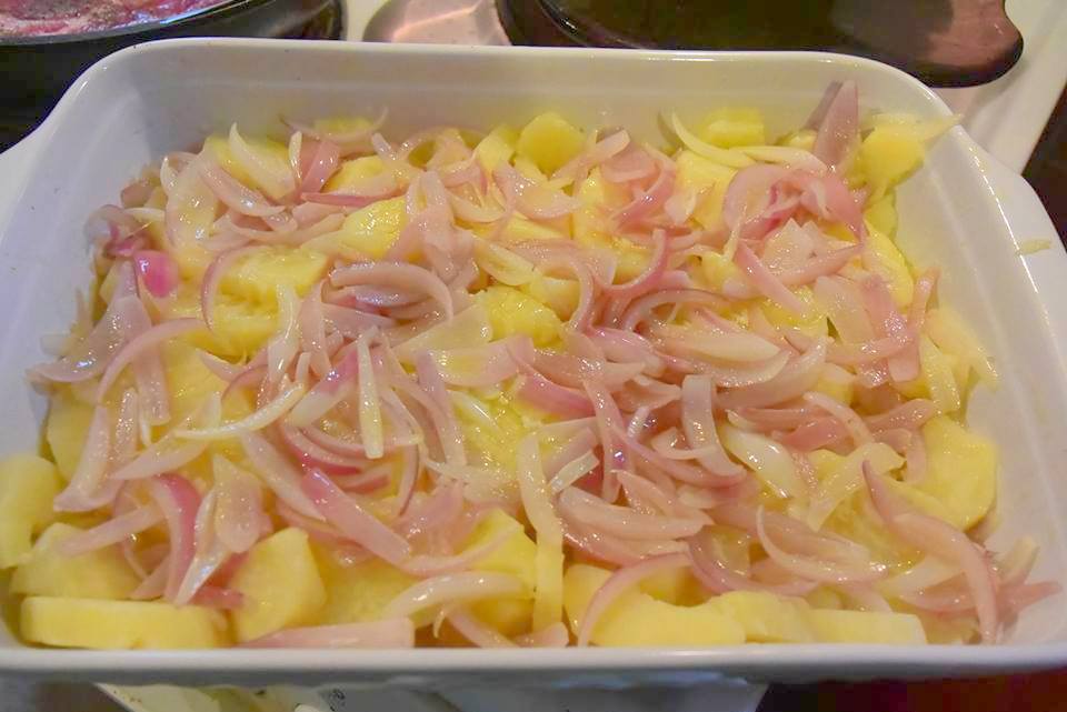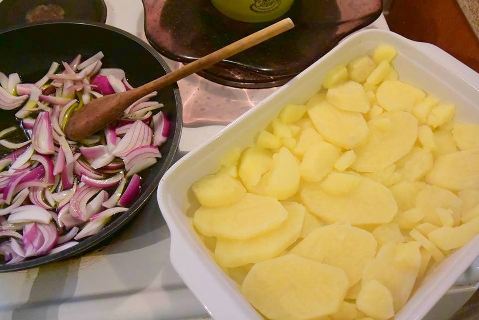 Τι κάνουμε Καθαρίζουμε κόβουμε και βράζουμε τις πατάτες σε αλατισμένο νερό . Σουρώνουμε και τις στρώνουμε σε λαδωμένο ελαφρώς ταψάκι . Βάζουμε λίγο λάδι στο τηγάνι ρίχνουμε μέσα τα κρεμμύδια και τα σοτάρουμε ελαφρώς ίσα να γυαλίσουν ,με τρυπητή κουτάλα τα βγάζουμε και τα στρώνουμε επάνω από τις πατάτες στο ταψάκι .