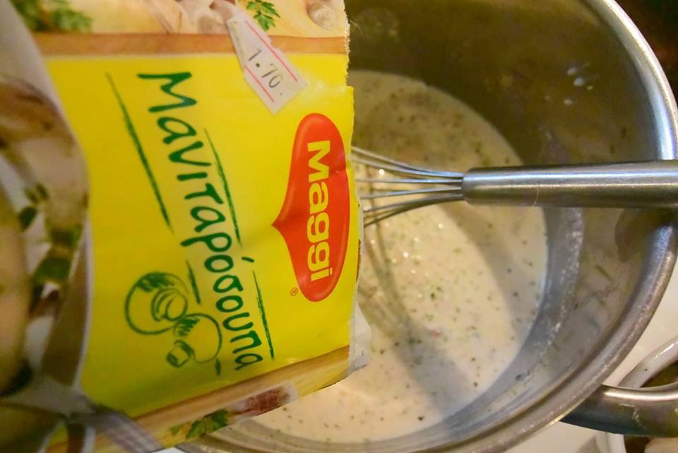 Φτιάχνουμε την μανιταρόσουπα σύμφωνα με τις οδηγίες φακέλου δηλαδή αραίωσα το Νουνού 1και 1/2 κούπα γάλα και 1 και 1/2 νερό ρίχνουμε και το μείγμα του φακέλου ανακατεύουμε βράζει 5 λεπτά και το ρίχνουμε επάνω από τις μπριζόλες .
