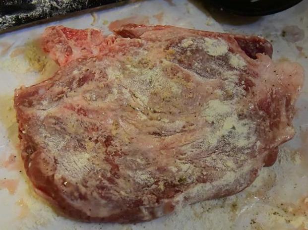 Στο ίδιο λάδι βάζουμε τις μπριζόλες αφού πρώτα τις πλύνομε τις αλατοπιπερώσουμε και τις περάσουμε ελαφρώς με λίγο αλεύρι και τις τσιγαρίζουμε ελαφρώς γυρνώντας τακτικά να δούμε να πάρουν λίγο χρώμα . Τις στρώνουμε από πάνω από τα κρεμμύδια .