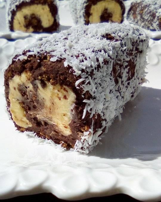 Τοποθετούμε την κρεμά πάνω στη βάση που έχουμε φτιάξει και το ρολάρουμε μετά το τοποθετούμε στο ψυγείο!!! Όταν κρυώσει το βγάζουμε το κόβουμε σε κομμάτια και το βουτάμε στην καρύδα!!!!!