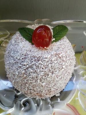 Σε 7-8 φλιτζανάκια του ελληνικού τον 150 μλ η ποτηράκια τα γεμίζουμε με την κρέμα αφήνουμε να κρυώσει και βάζουμε στο ψυγείο για 4-5 ώρες. Για να βγάλουμε την κρέμα ξεκολλάμε γύρω γύρω από πάνω και αναποδογυρίζουμε το φλιτζανάκι σε πιάτο που έχουμε βάλει 80 γρ ινδική καρύδα και κυλάμε να κολλήσει παντού. Στολίζουμε με κερασάκι και φυλλαράκια δυόσμου -προαιρετικά !!!
