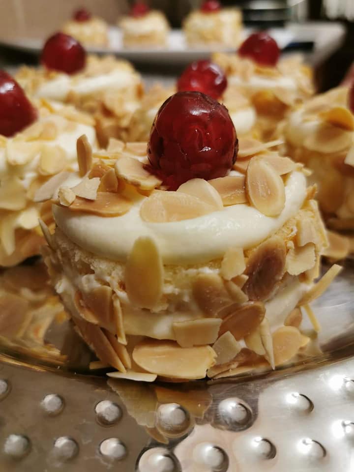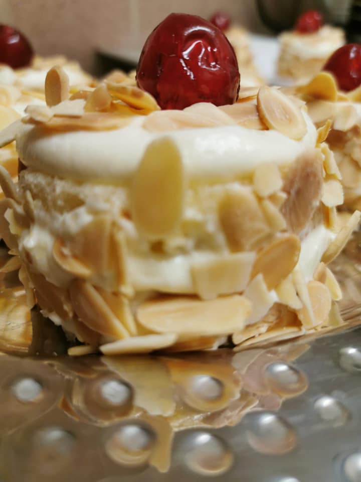 Υπέροχη κλασική πάστα αμυγδάλου. Ένα αγαπημένο γλυκό με αφράτο σιροπιασμένο παντεσπάνι, πλούσια κρέμα, αέρινη σαντιγί και φυσικά αμύγδαλο φίλε γεμάτο αρώματα.