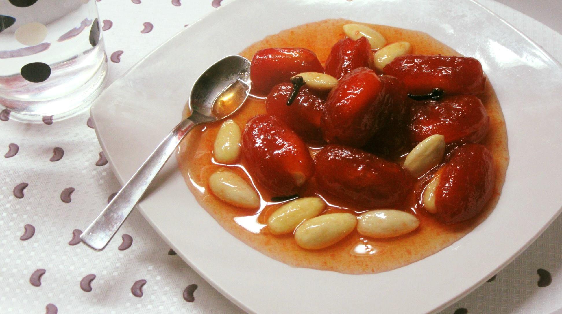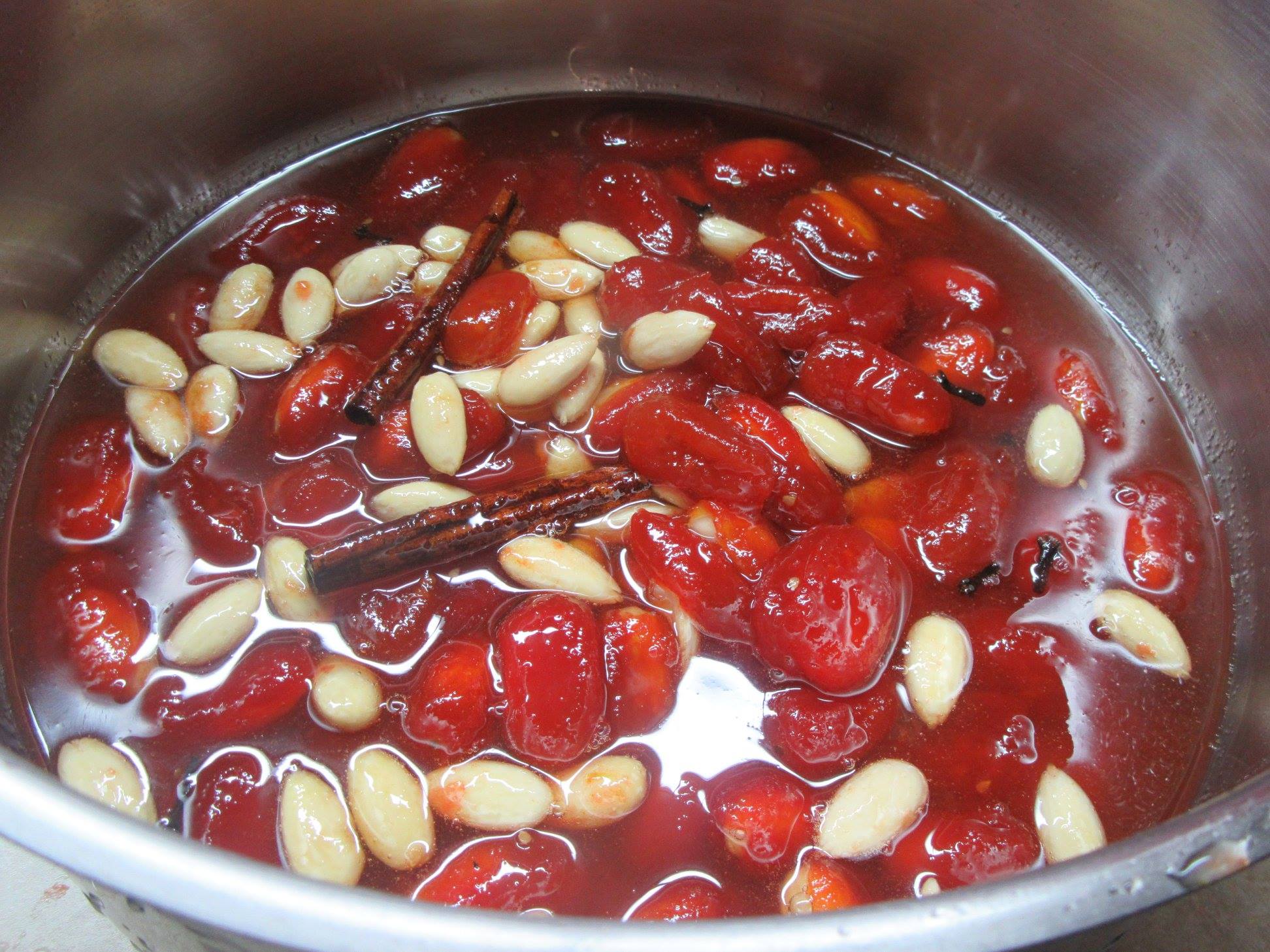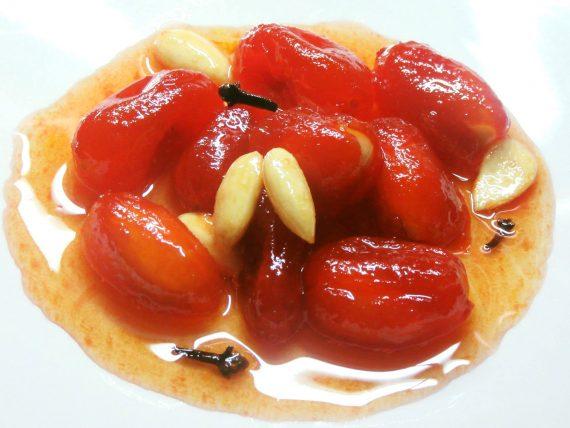 .Σε αυτό το σημείο και πριν βάλετε τα ντοματακια στην φωτιά μπήγετε ένα ασπρισμένο αμύγδαλο μέσα σε κάθε ντοματάκι, Βράζετε τα ντοματάκια για 15 λεπτά μονο..τα αφήνετε μια μέρα και μα νύχτα μέσα στο σιρόπι τους και τέλος τα βράζετε μέχρι να δέσει το σιρόπι τους ..περίπου άλλα 15 λεπτά…Τελος ρίχνετε το ανθόνερο και μερικές σταγόνες απο μισό λεμόνι και αν θέλετε έχτρα αμύγδαλα.