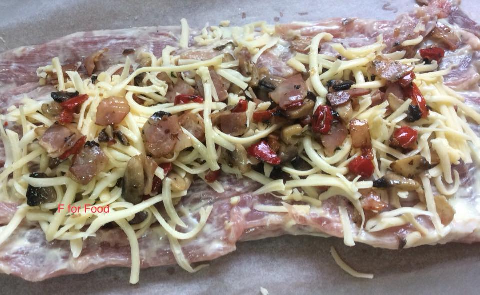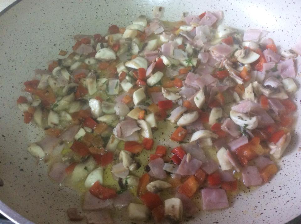 Σε τηγάνι σοταρισα με λίγο βούτυρο και ελαιόλαδο,μανιτάρια ψιλοκομμένα,μπέικον,πιπεριά κόκκινη και λίγο μυρωνι