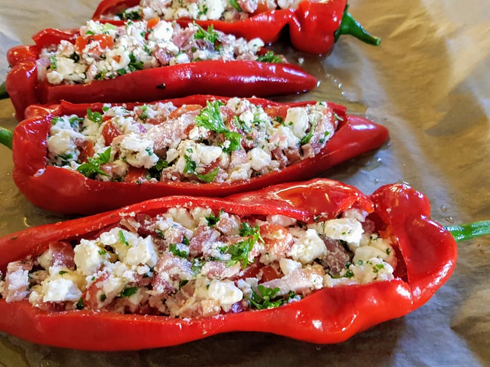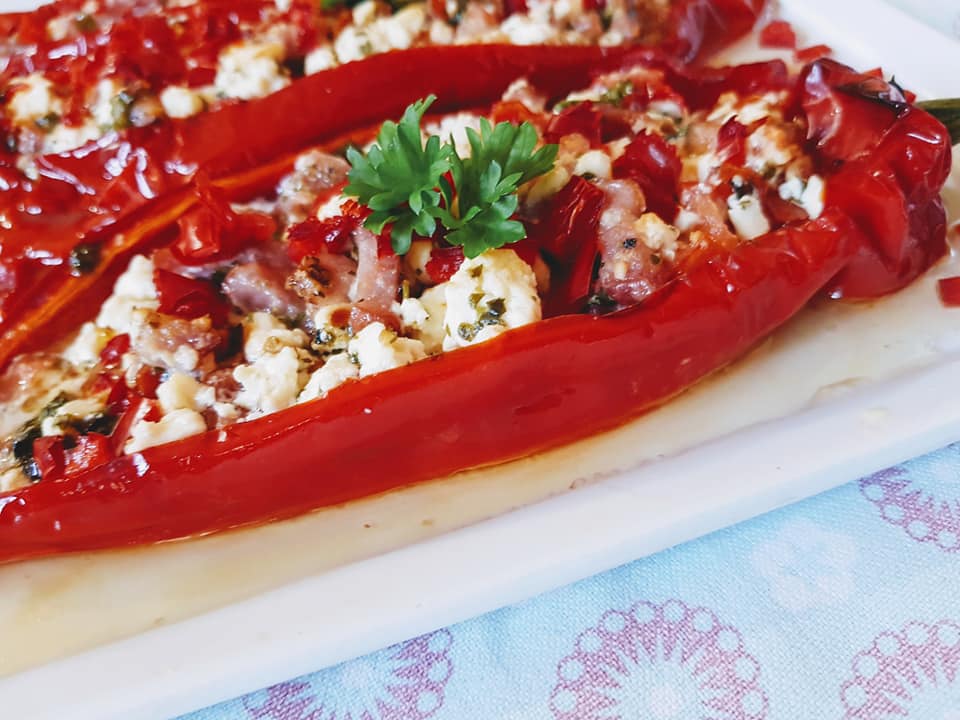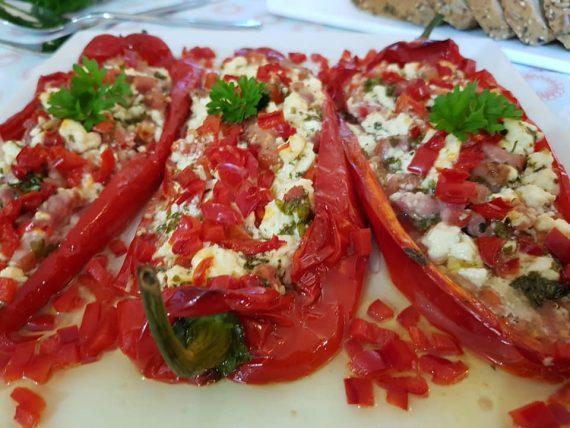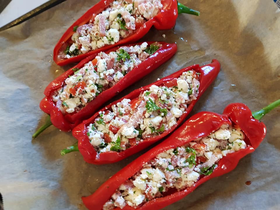 Βγάζουμε τις πιπεριές αφού μαλακώσουν λίγο, τις γεμίζουμε και Ρίχνουμε ψηλοκομενη πιπεριά από πάνω Ραντίζουμε πάλι με ελαιόλαδο Ψήνουμε στους 200 βαθμούς Μέχρι να ψηθούν κ να μαραγιασουν
