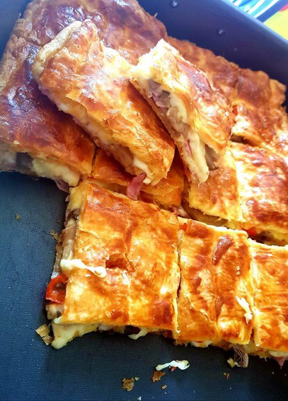 Αφού βουτύρωσα το ταψί έβαλα κάτω ένα φύλλο σφολιάτας, τα υλικά της αρεσκείας σας, εγώ έβαλα ζαμπόν,γκούντα,μανιτάρια,πιπεριά Φλωρίνης και μπέικον. Έκλεισα καλά με το άλλο φύλλο σφολιάτας άλειψα το φύλλο με ένα κρόκο αυγού από πάνω και έψησα, τόσο άπλα!!!!