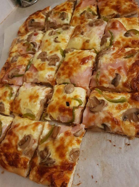 Ζύμωσα για 10 λεπτάκια δυνατά, άφησα να ξεκουραστεί για 30 λεπτάκια το ζυμάρι μου σε ζεστό σημείο το άνοιξα σε σχήμα πίτσας,έβαλα από πάνω τα υλικά της αρεσκείας μου,και έψησα σε ανάποδο ταψί, αφού το είχα στο φούρνο στους 250 βαθμούς να κάψει το πρώτα μόνο του, μετά προσεχτικά έβαλα τη πίτσα πάνω στο ταψί με τη βοήθεια λαδόκολλας, κι ακούμπησα το ταψί κάτω στον πάτο της κουζίνας κι έψησα στους 230 αντιστάσεις για 20 λεπτά ανάλογα το πάχος που έχει το ζυμάρι σας(Από 10 έως 20 λεπτά).