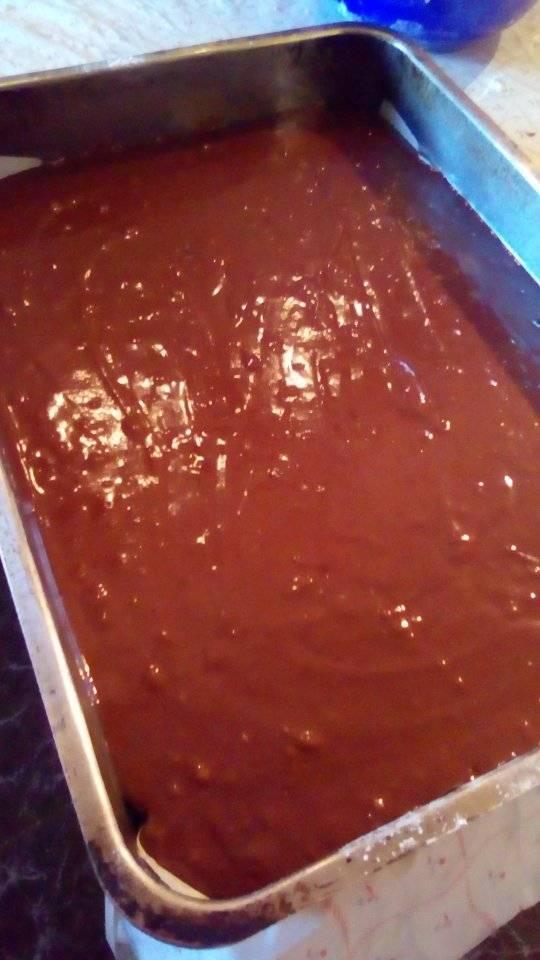 Συνεχίζουμε ρίχνουμε τις βανίλιες,και τα αυγά γρήγορα ανακάτεμα να μην κόψουν. Τέλος προσθέτουμε αλεύρι,σόδα,αλάτι. Θέλουμε ένα πηχτό μείγμα. Το τοποθετούμε στην λαδόκολλα στο ταψί και το ψήνουμε σε προθερμασμένο φούρνο στους 180 βαθμούς μεσαία σχάρα για 30 λεπτά. Αφήνουμε να κρυώσει.