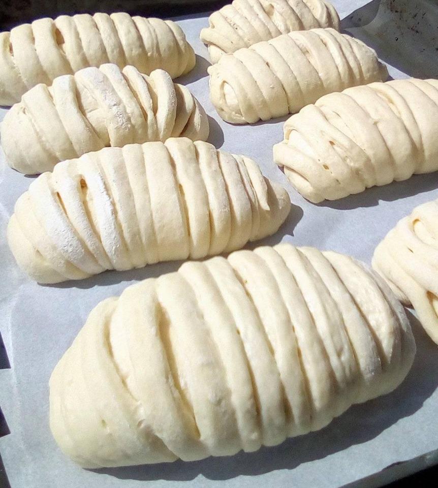 Αυτά τα κομμάτια τα κάνουμε μπαλίτσες τις οποίες.σκεπάζουμε για.20 λεπτά. Συνεχίζουμε ανοίγουμε την κάθε μπαλίτσα σε πλατύ φυλλαράκι κόβουμε λωρίδες λεπτές αλείφουμε με γάλα,η σπορέλαιο τοποθετούμε στην άκρη μαρμελάδα και τα τυλίγουμε σαν φάκελο. Τα τοποθετούμε στην λαδόκολλα τα σκεπάζουμε για.20 λεπτά.