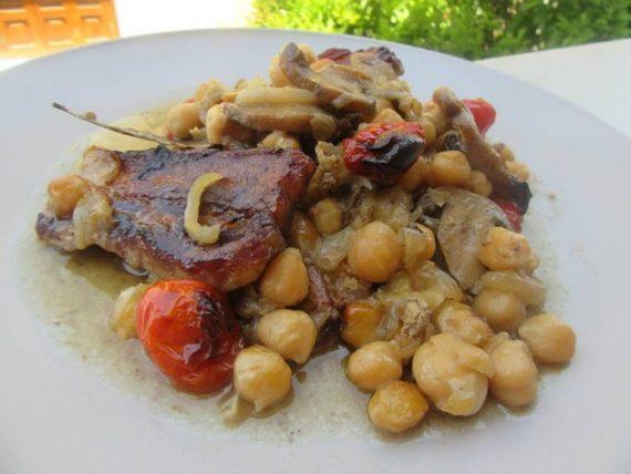 Ρεβίθια στο φούρνο με χοιρινές πανσέτες, μανιτάρια, ντοματίνια και κρεμμύδι. Ένα πολύ εύκολο και νόστιμο οικογενειακό φαγητό. Ιδανικό για να φάνε τα παιδιά λαχανικά και όσπρια σε ένα πιάτο!
